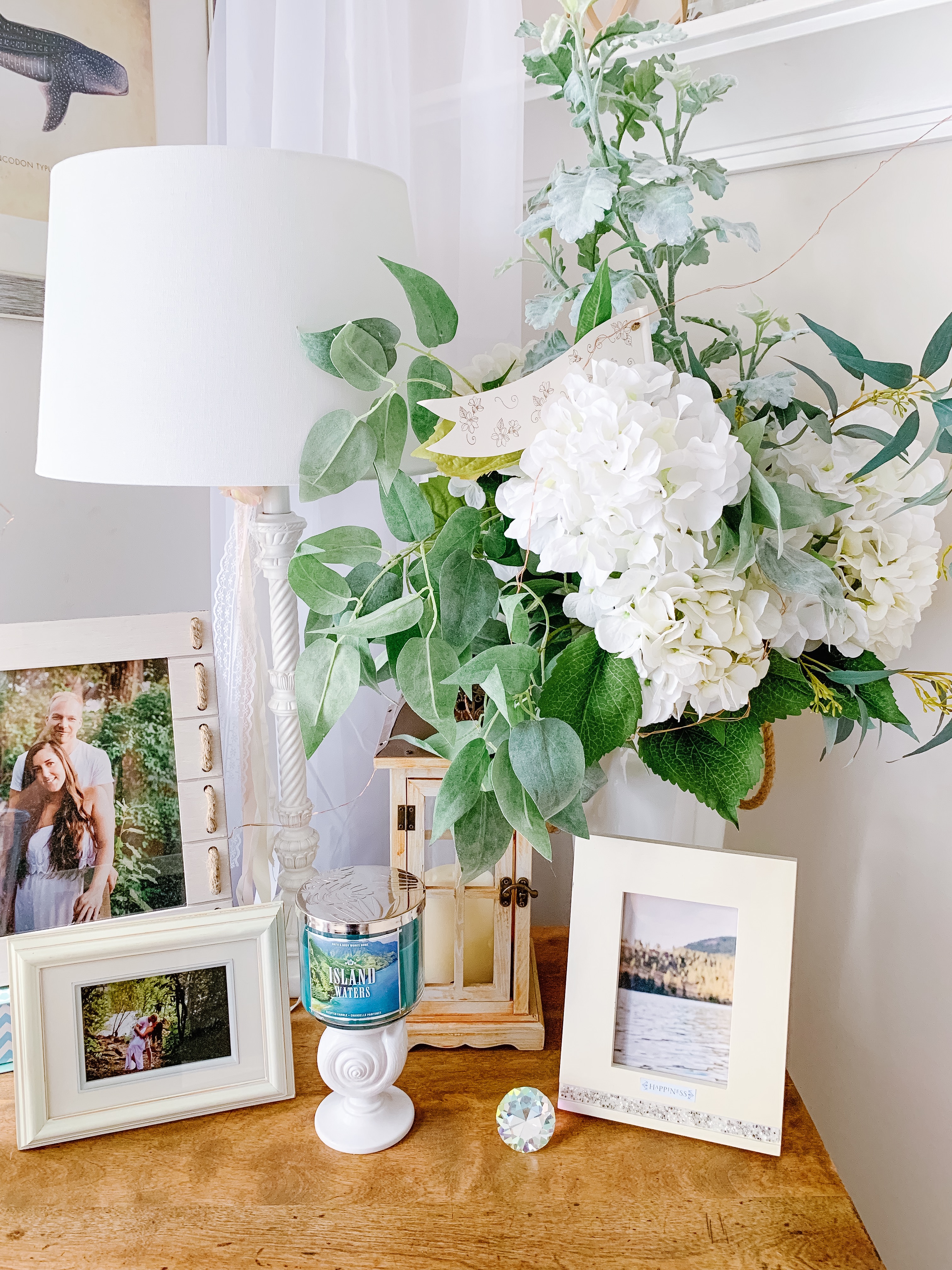 Instead of only hanging photos, try placing them on a table or shelf, leaning against the wall. It adds a bit of interest behind table decor, and using items with different heights makes your decor look more polished and put together.