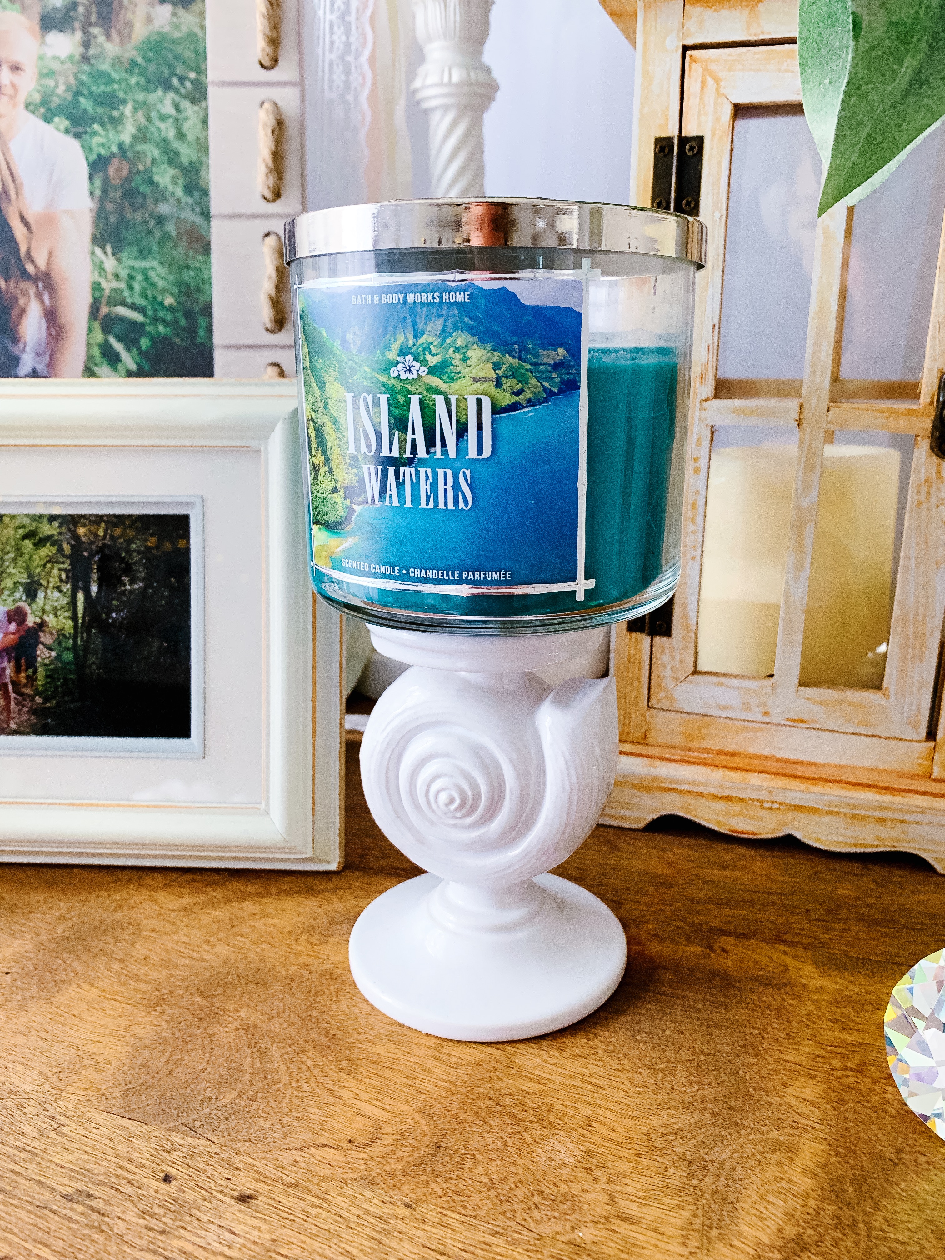 I’ve collected many Bath & Bodyworks candles over the years, and I swap them out with the seasons. I really like the labelling, and after I’ve burned the candles down, I clean out the jars and use them for storage. You can also find pretty candle holders at Bath & Body – that’s where this seashell pedestal is from.