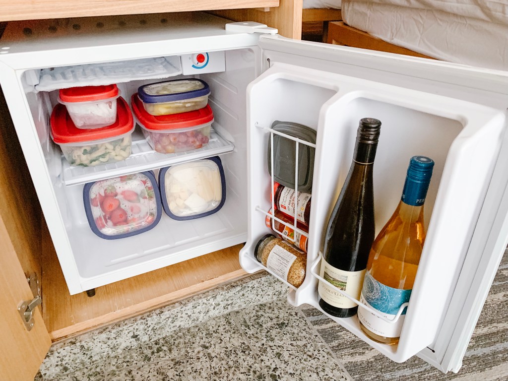 To avoid this problem, meal prep to reduce packaging, and bring everything in a cooler bag with some frozen water bottles. That way, if your food doesn’t fit in the fridge, you can just leave it in the bag and use the fridge for drinks.