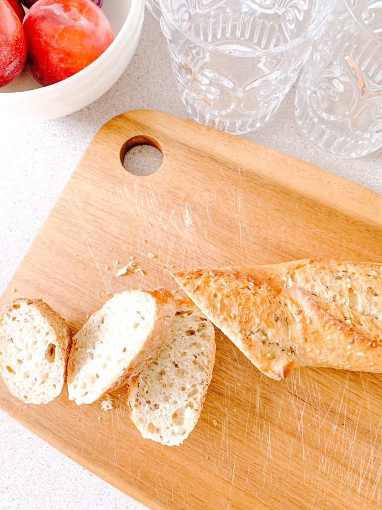 While the baguette is in the oven, slice the plums into a thin wedges.