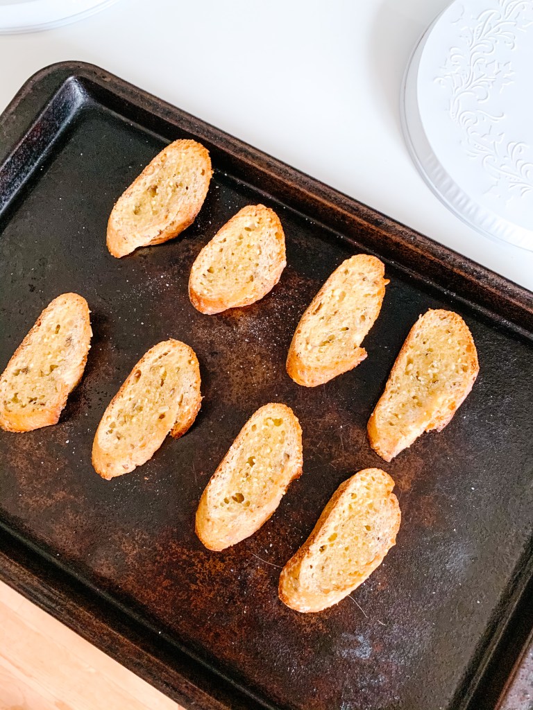 Slice baguette at an angle, into 1/2″ thick pieces.