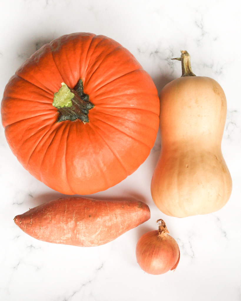 For the pumpkin and squash in this recipe you can truly use any kind of pumpkin or squash that you would like. These are the ones we like best but if you would prefer to use different kinds go right ahead! You can even make this soup using pumpkin puree, just use one full can.