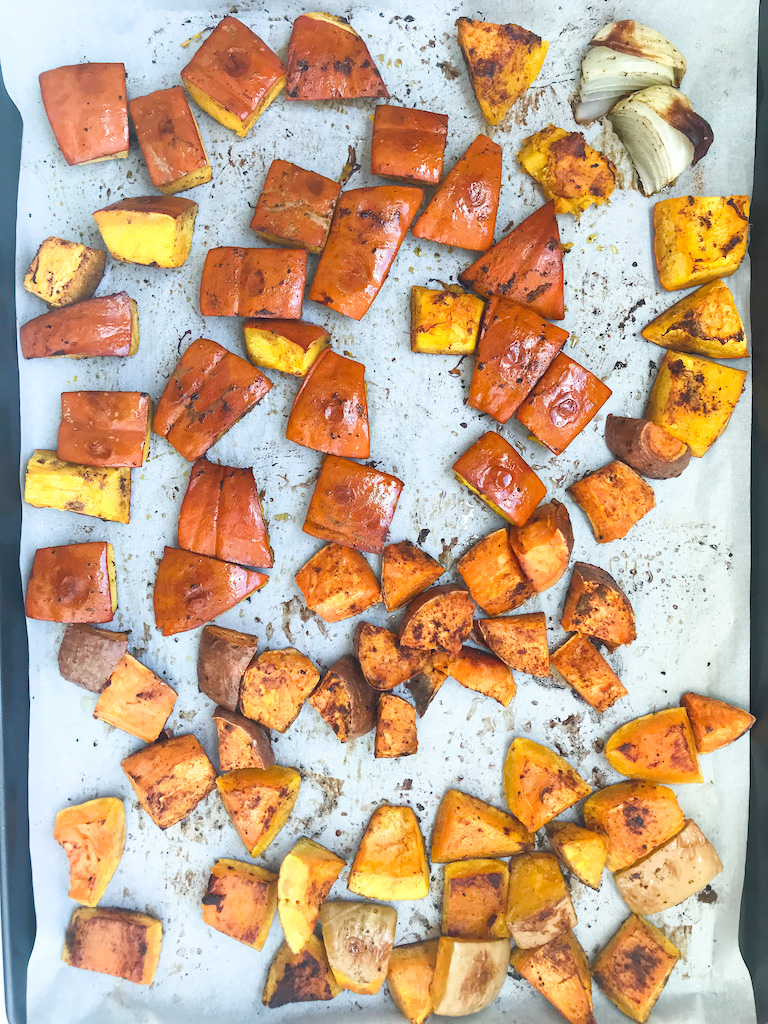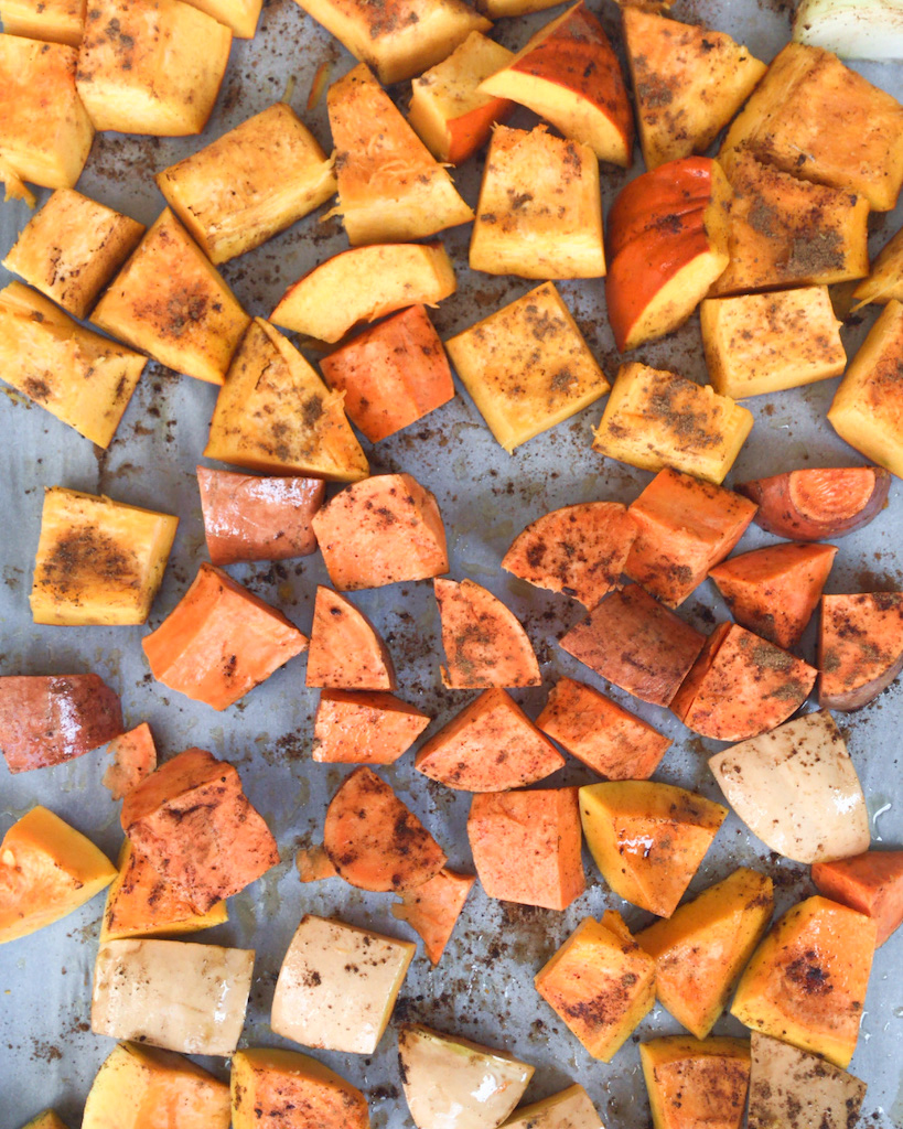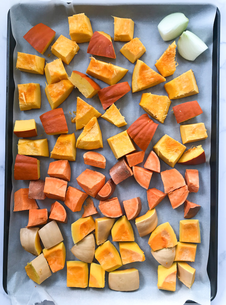 - On a pre-lined baking sheet, lay the cubes of pumpkin, butternut squash, sweet potato, and onion.