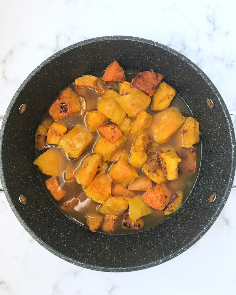- Once cool, peel the skin and place in a large pot. Add in about half of the carton of vegetable stock and the remainder of the spice mix along with salt.