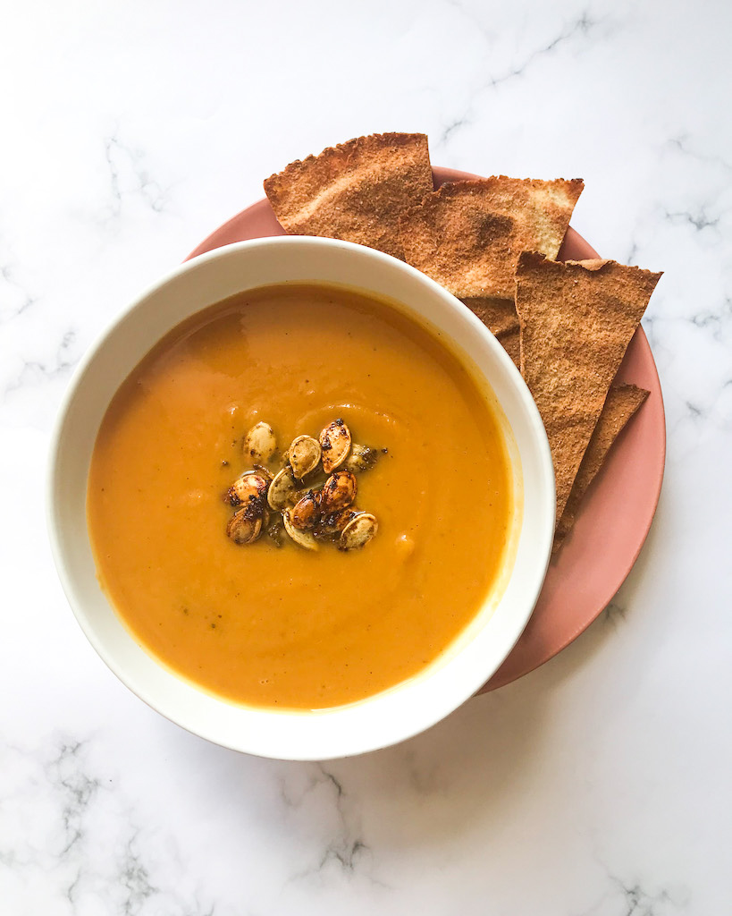 - Serve the soup with a garnish of some za’atar roasted pumpkin seeds and a side of crunchy pita chips.