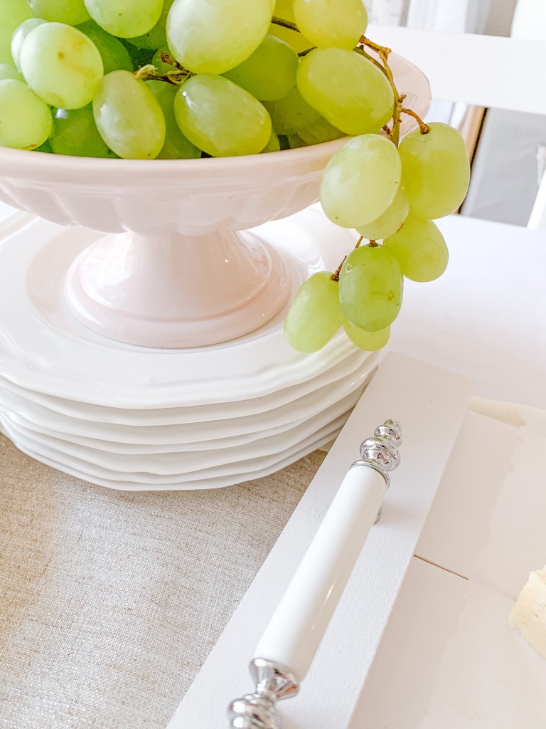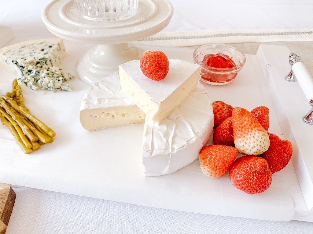 Now let’s add our fresh elements! I’m using strawberries and grapes. I gave the grapes their own tiered bowl, and artfully draped a few over the side. I removed the stems from the strawberries and arranged them in a neat pile, and also added one atop the brie wheel.