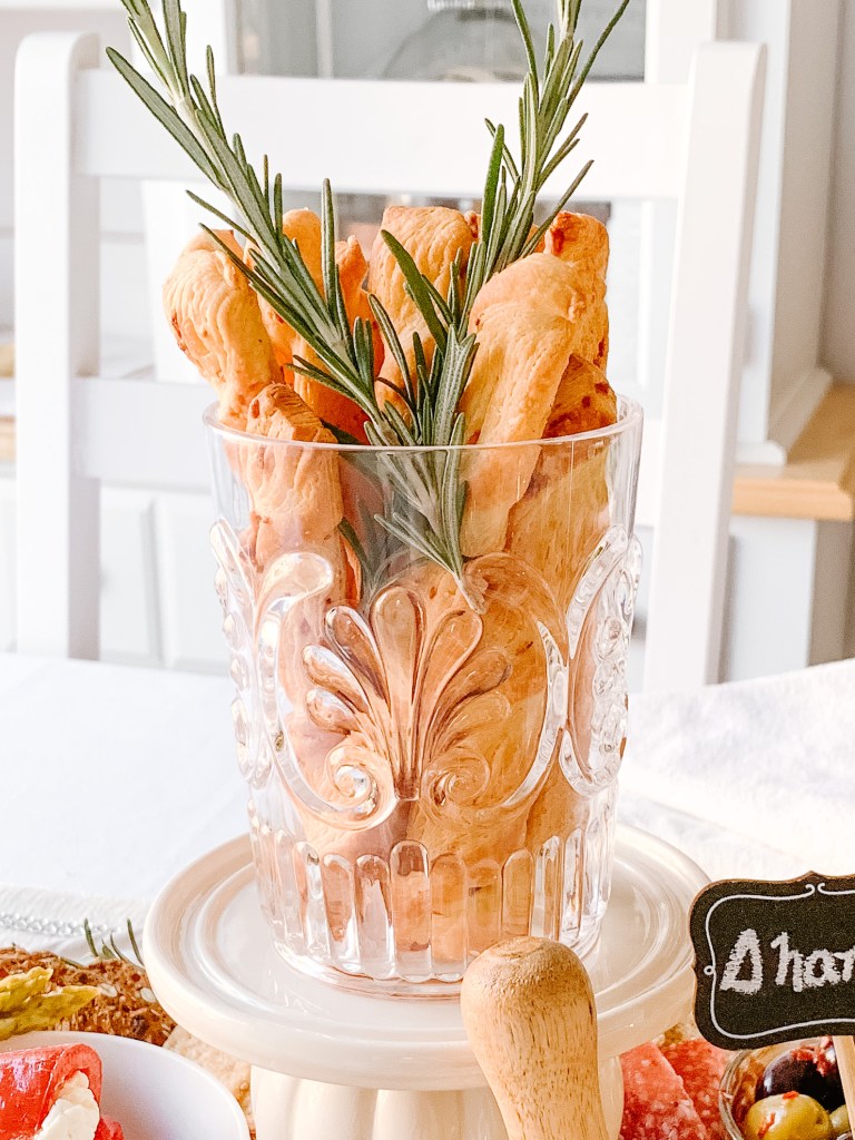 I like putting the breadsticks/twists in cups to add height, and also take up less space on the board.