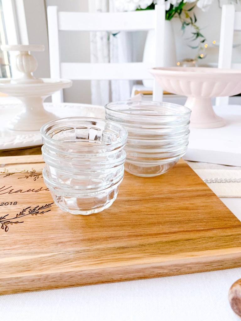 Gather your dishes. Think your favourite platters, trays, bowls, drinking cups and dip cups, cake stands, even candle holders!