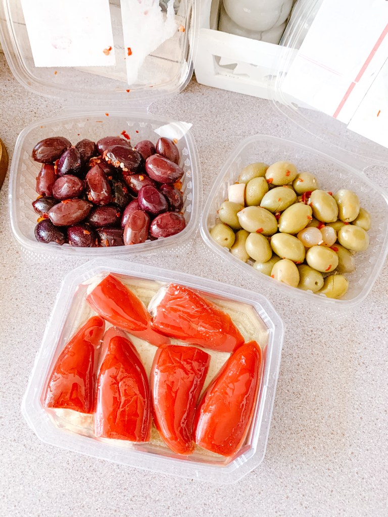 Start with everything in cups. Spreads, pickled things, and oily things. It’s easier to arrange around them rather than trying to fit them in at the end.