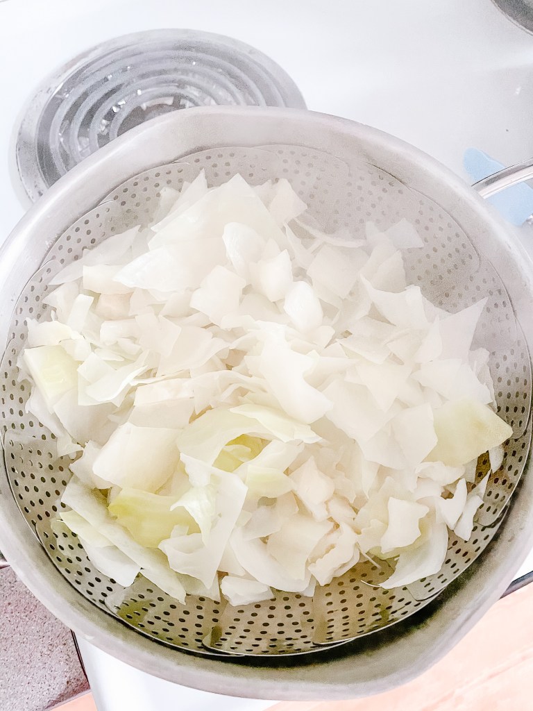 Chop cabbage into bite size pieces and peel apart leaves. Steam cabbage in a large pot with a steamer basket until just translucent.