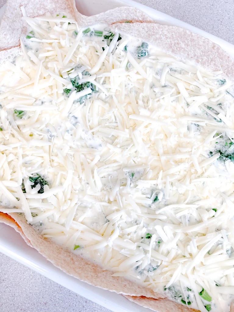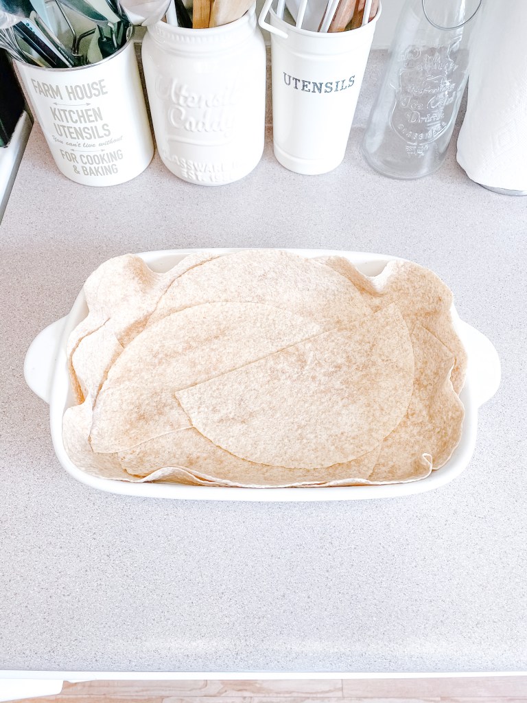 Preheat oven to 350°, and generously butter a large rectangular casserole dish. Slice the tortillas in half, and line the casserole dish with the tortillas, taking care that the tortilla edges are no more than 1 inch above the side of the dish.