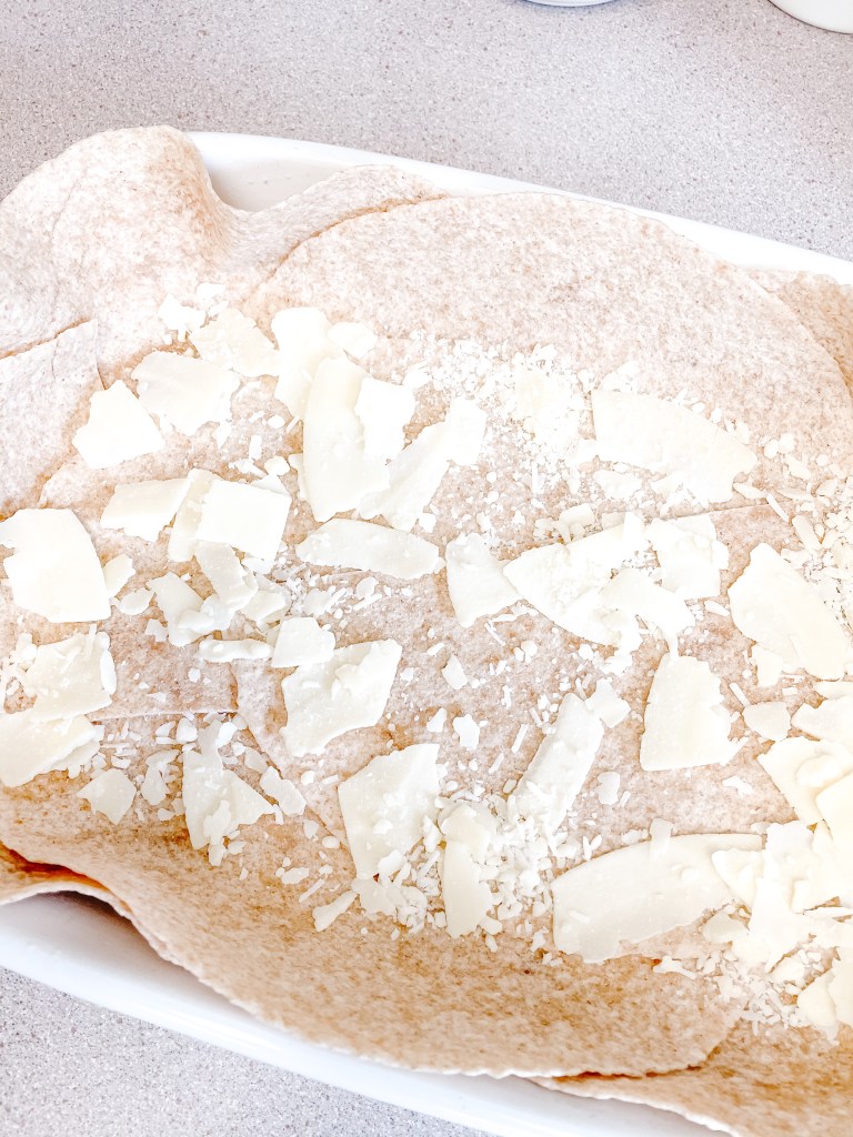 Evenly spread parmesan petals over the tortillas.