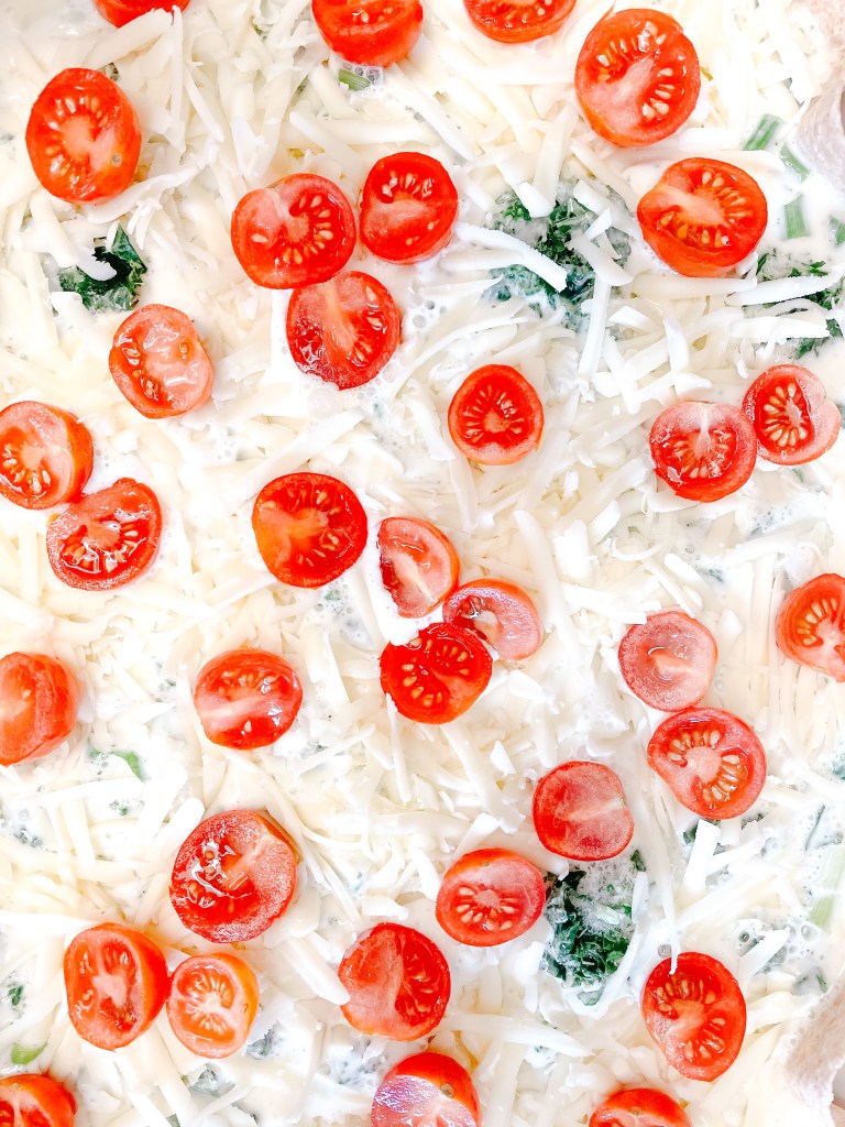 Top with vegetables of your choice. Good combos? Spinach, kale and tomato, bell peppers and onions, asparagus and salmon, and bacon and mushrooms, to name a few! In this recipe, I’m using frozen spinach and kale, green onions, and tomato.