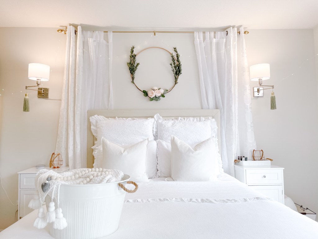 Boy, has our bedroom levelled up this year. I love how it’s coming along, and looking more and more polished! I tell ya, sconces, a headboard and a rug is just the ticket to elevate your bedroom. Well, those and a wreath from Shop Jamie Krause hehe!