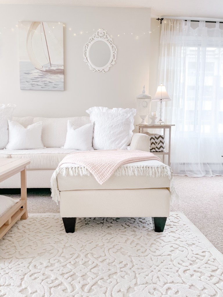 Also starring is our cream white sectional from L Furniture and More. You can find the make and model here. Throughout our home you’ll see several touches from a local online Home Decor shop I’m currently partnered with, White Haven Home! Pictured here is the Blush Honeycomb Throw.