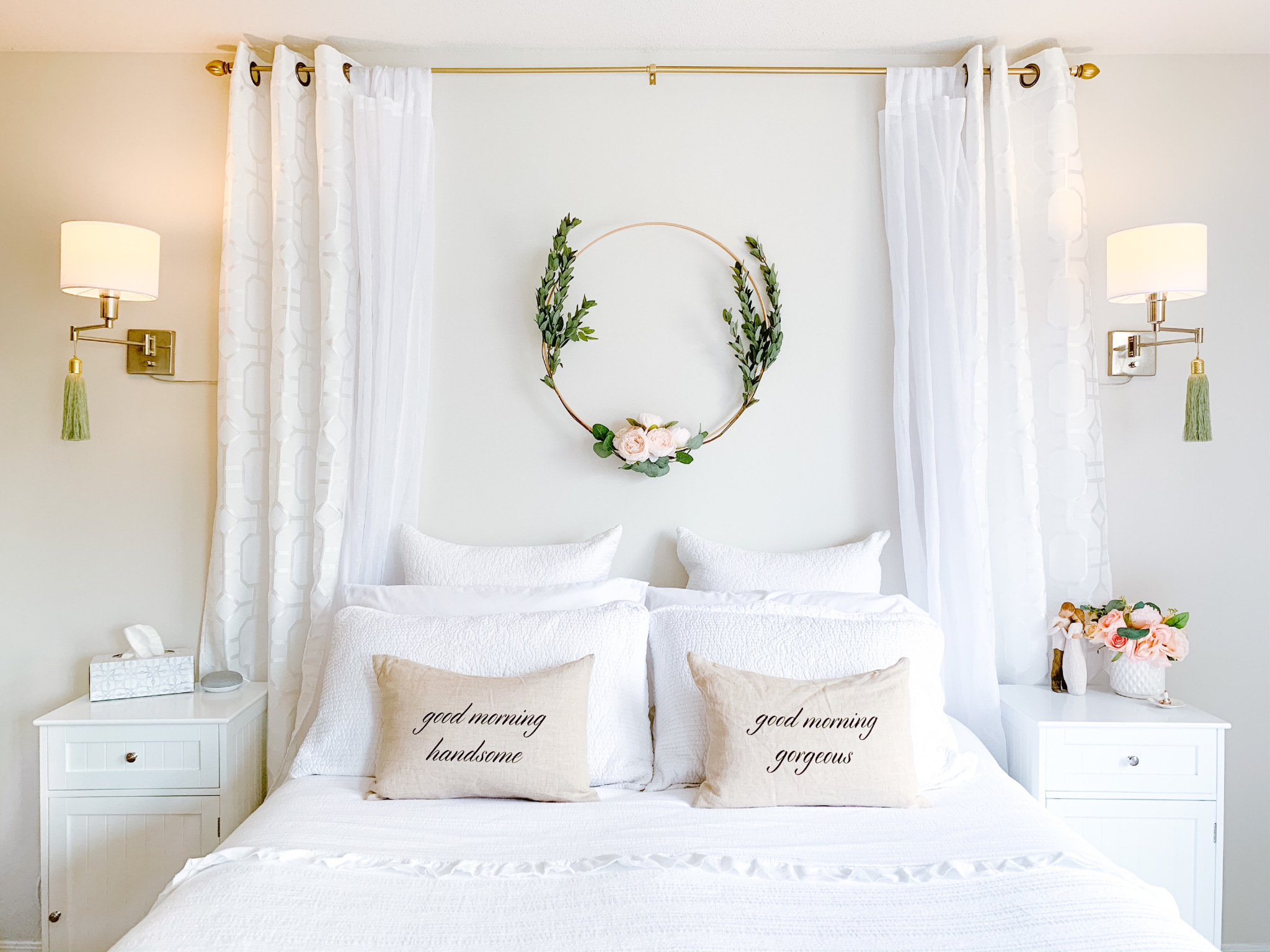 A bedroom isn’t complete without a Shop Jamie Krause wreath over the bed! And how nice it looks with the new upholstered tufted headboard.
