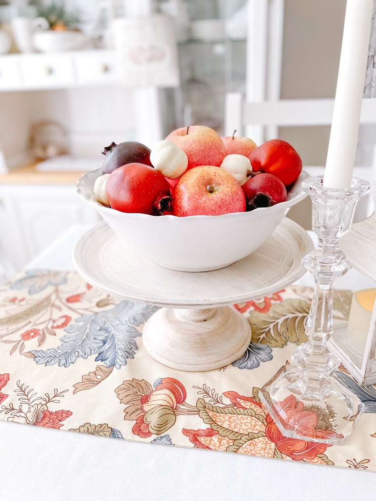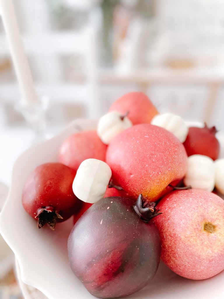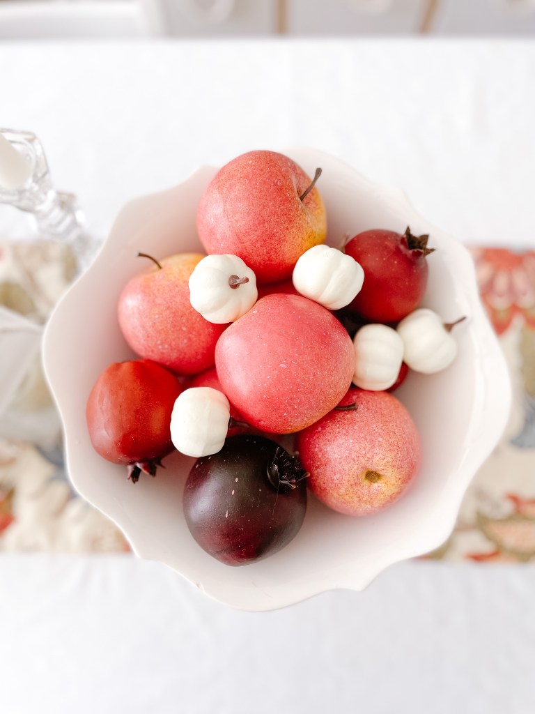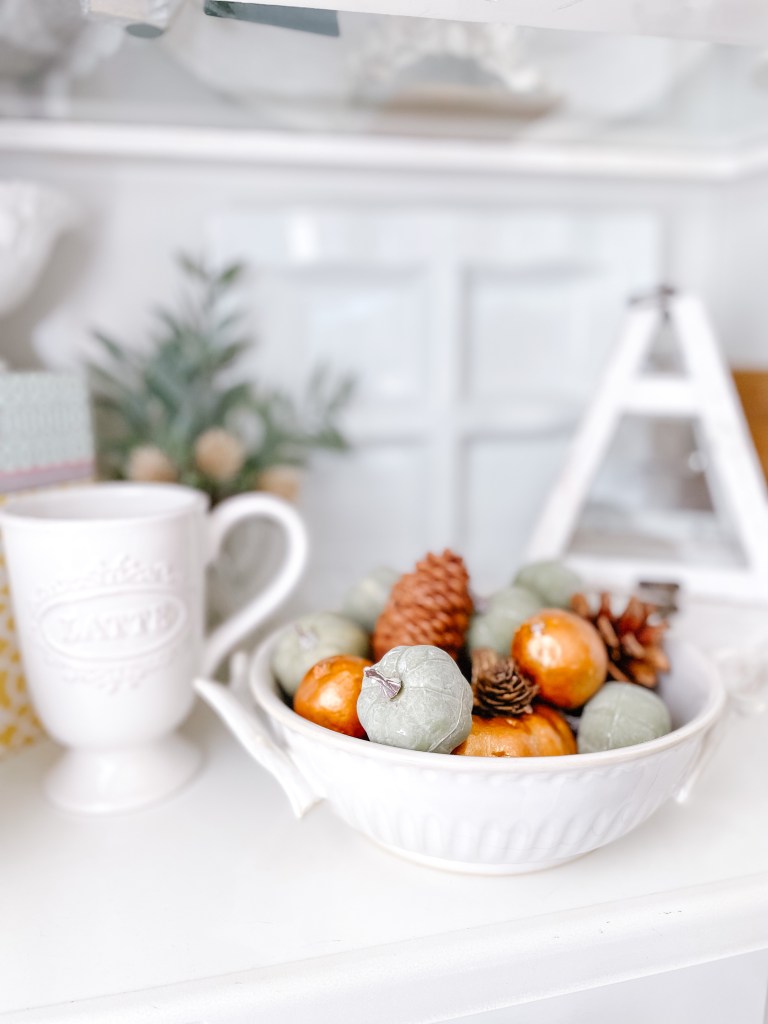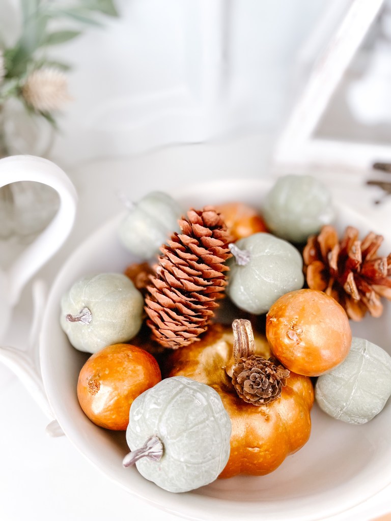 The most obvious first, of course! Pumpkins are a must, but you should also try out things like apples, gourds, pinecones, pomegranates, and anything else that feels ‘fall’ to you. Swipe through the slides above to see how I’ve used pumpkins and bowl fillers throughout my home. Don’t limit yourself to actual pumpkins either, you can also try art prints, pumpkin printed linens, and anything else pumpkin adorned.