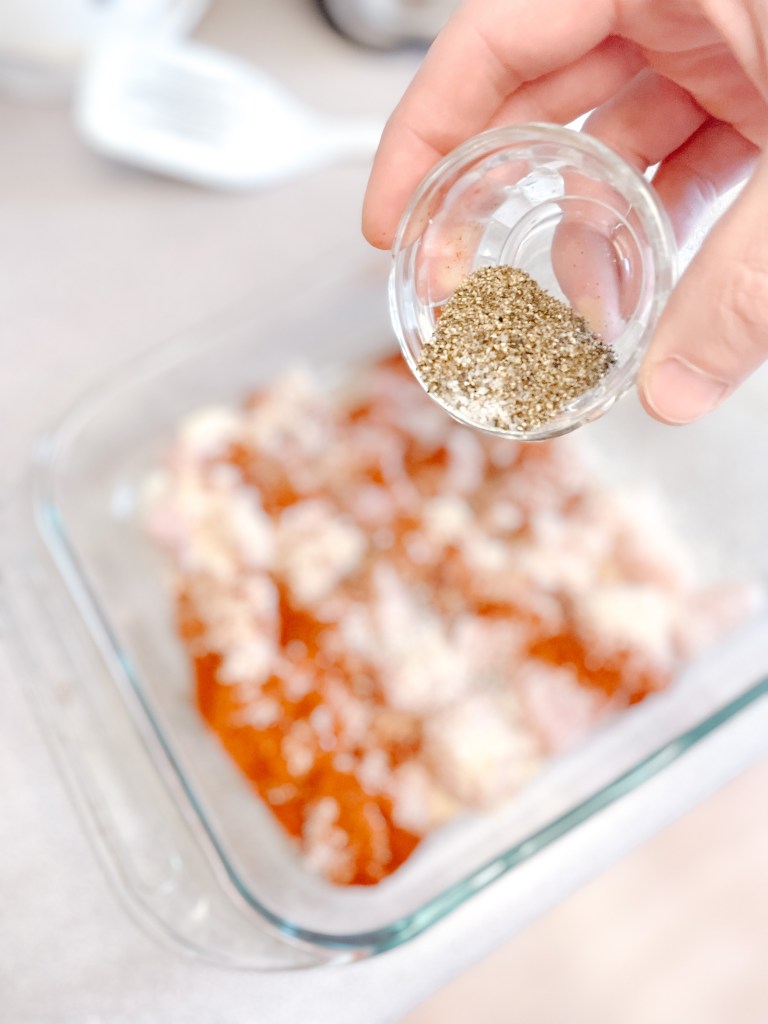 Slice chicken into bite sized chunks. In a dish, combine spices and thoroughly coat chicken chunks. Don’t be shy with the spices!