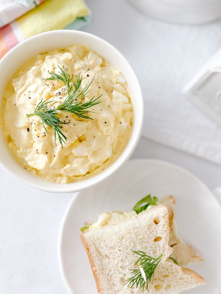 Spread mayo onto 6 slices of bread, and distribute egg salad evenly over 3 slices. Top with dill, a handful of lettuce, and a second bread slice. Cut into quarters or strips, garnish with fresh dill, and serve immediately.