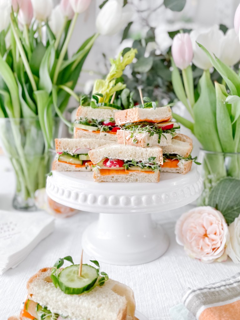 Slice cucumber and radish into 1/4″ rounds, and use a peeler to make carrot ‘ribbons’. Mix together mayo, cream cheese, lemon juice, sprinkle of lemon zest, basil, and garlic. Spread generously onto 6 slices of bread, and top 3 slices with cucumber, radish, carrots, a handful of lettuce, and microgreens. Top with second bread slice, and cut into quarters or strips. Serve immediately.