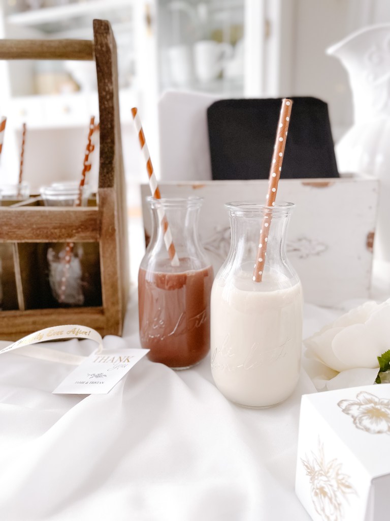 Serve your treats alongside glass milk bottles and an assortment of milks (traditional, chocolate, almond, you get the picture). Pictured here, we used the Vintage Glass Milk Bottle Favours, “Sippers” Small White Polka Dot Paper Straws in Pecan Brown, and the Candy Striped Paper Straws in Pecan Brown.