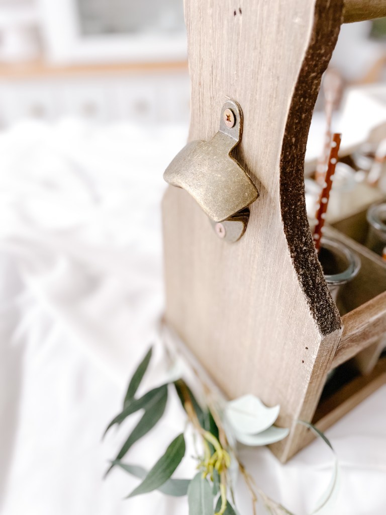 Add the Wooden Beer Bottle Caddy With Opener to your display for a rustic element. It also matches the wooden tray in this display to a T!