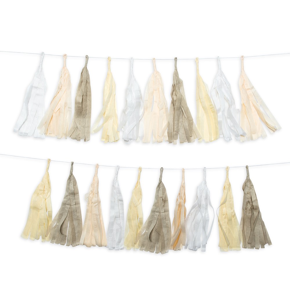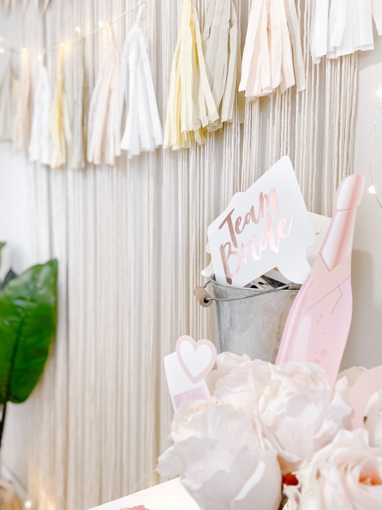 Next, we used Weddingstar’s Gold Foil Letter Banner to spell out the phrase, ‘Miss to Mrs’. This is a handy banner kit to have on hand, as it can be used time and again to spell out anything you can think of! Along with the message, we interspersed Weddingstar’s Tissue Tassel Garland. We cut it into two segments to make two smaller banners.