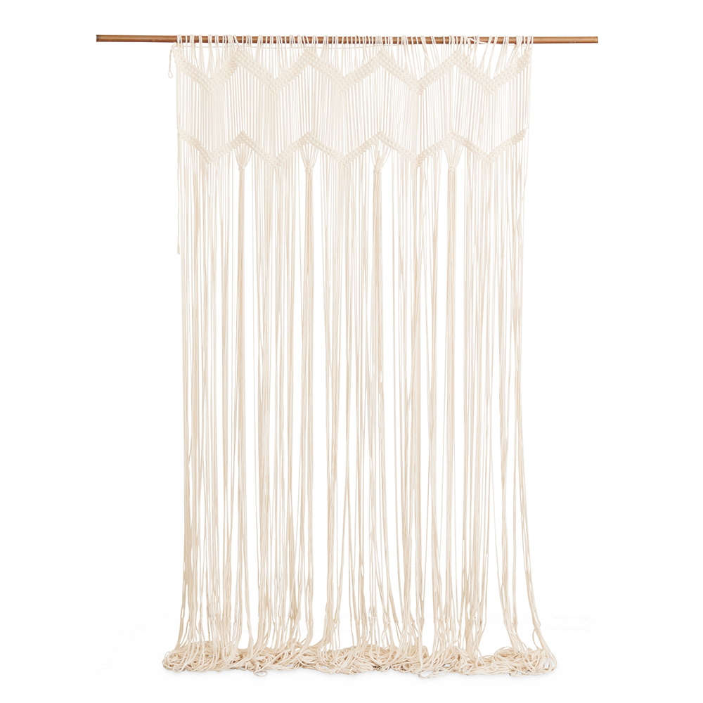 To build your Bohemian Photo Booth Backdrop, start with the basics: a large hanging backdrop, and plenty of greenery. In this display, we used Weddingstar’s new Macrame Hanging Photo Backdrop, and set of two new Eucalyptus Table Garlands. To ensure the backdrop hangs uniformly (and won’t fall during the festivities!), we hung it from a basic white curtain rod. We used one garland along the top of the rod, and placed one on the floor, woven amongst the other photo booth props. We used a small, white end table to hold the photo booth props, along with a few more decor accents.