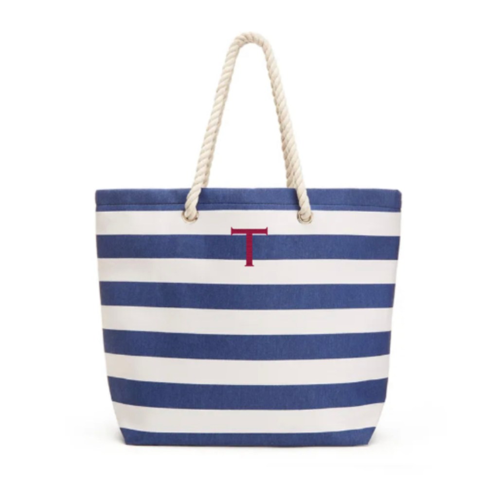 Personalized Monogrammed Cotton Canvas Beach Tote Bag- Bright Stripes, Personalized Extra-Large Cabana Stripe Canvas Fabric Tote Bag – Navy