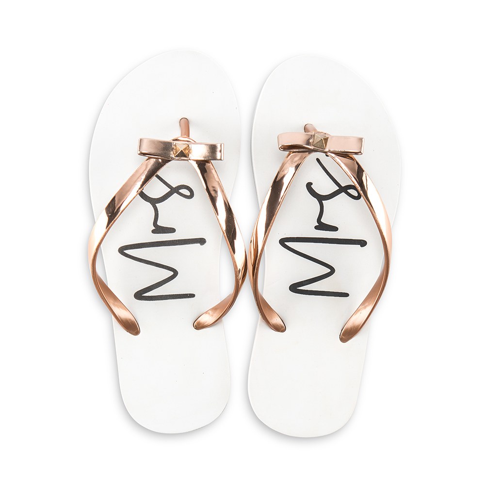 Women’s White & Rose Gold Flip-Flops With Bow – Mrs, Women’s Blush Pink & Rose Gold Flip-Flops With Bow – Babe, Best Day Ever Wedding Favour Flip Flops – Ivory White