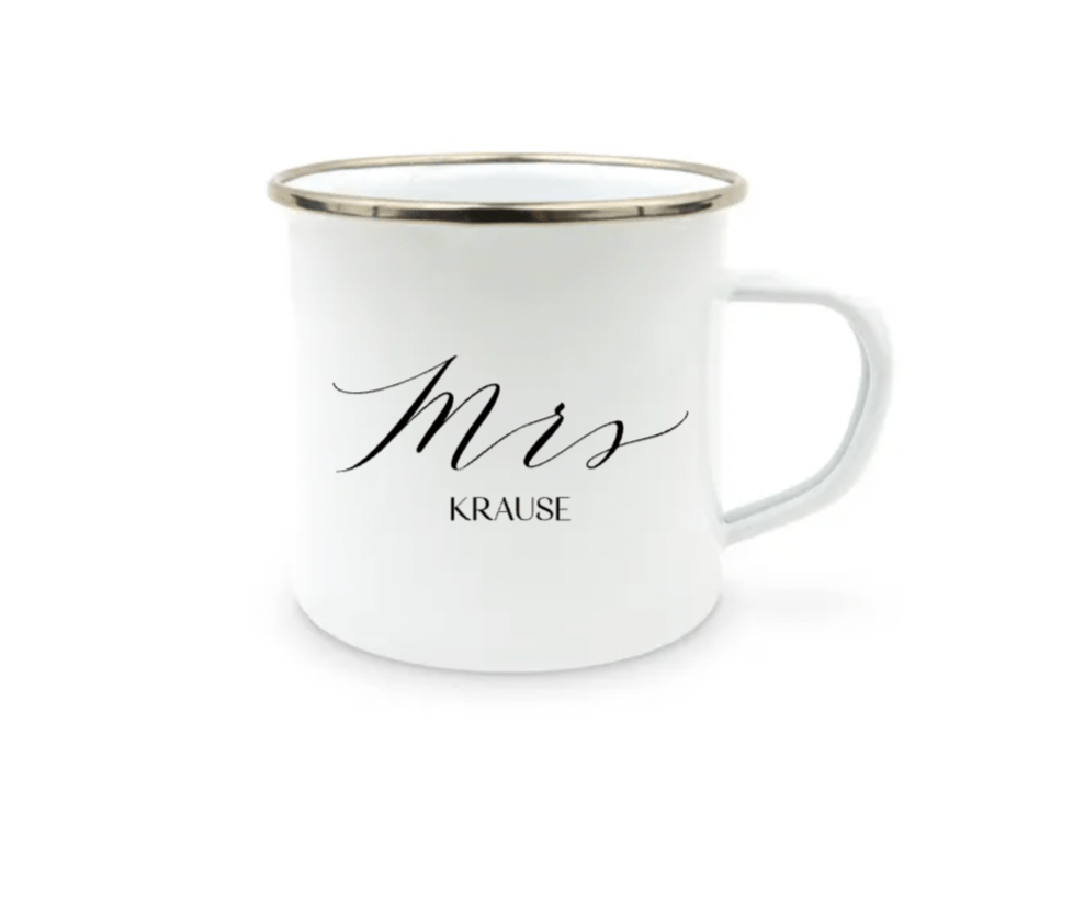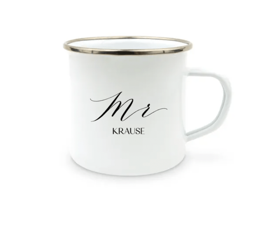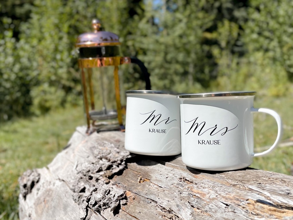 Personalized White Enamel Stainless Steel Coffee Mug – Mrs, Personalized White Enamel Stainless Steel Coffee Mug – Mr