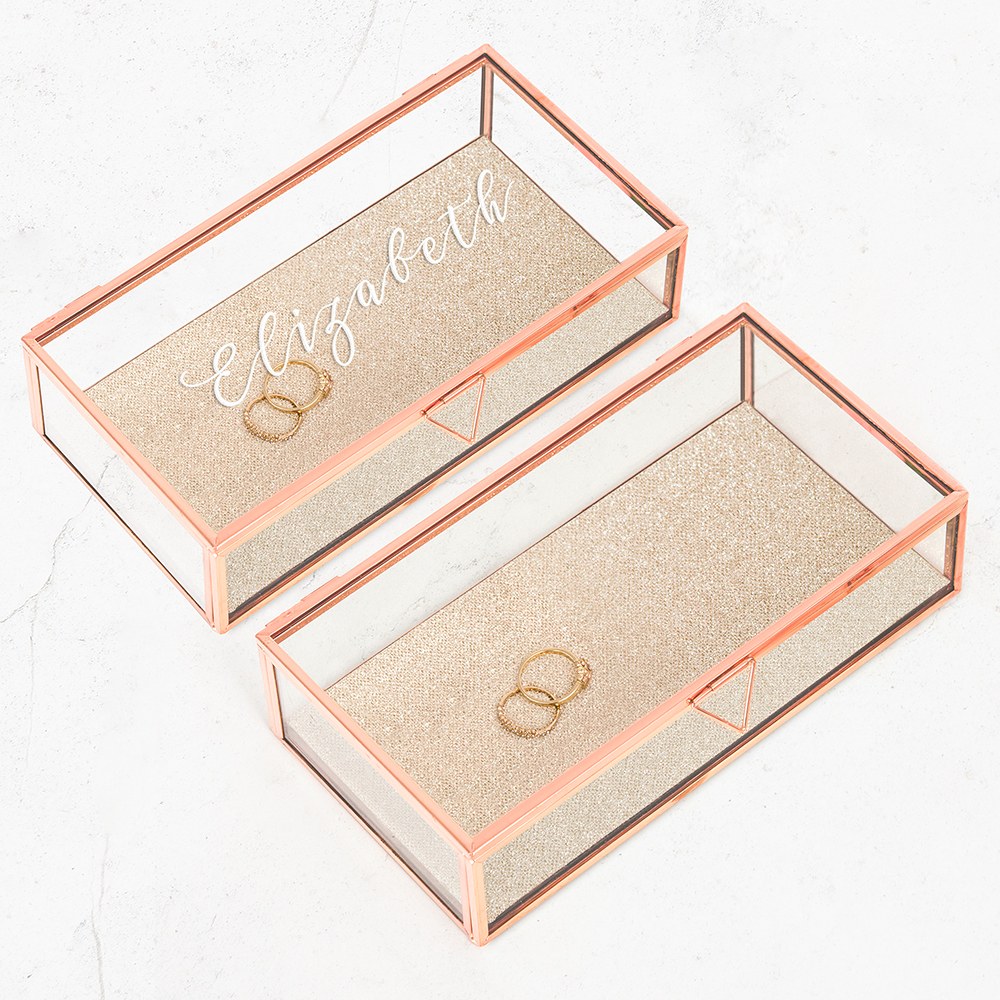 Glass Jewellery Box With Rose Gold Edges, Large Personalized Rectangle Glass Jewellery Box- Elegant Calligraphy Print