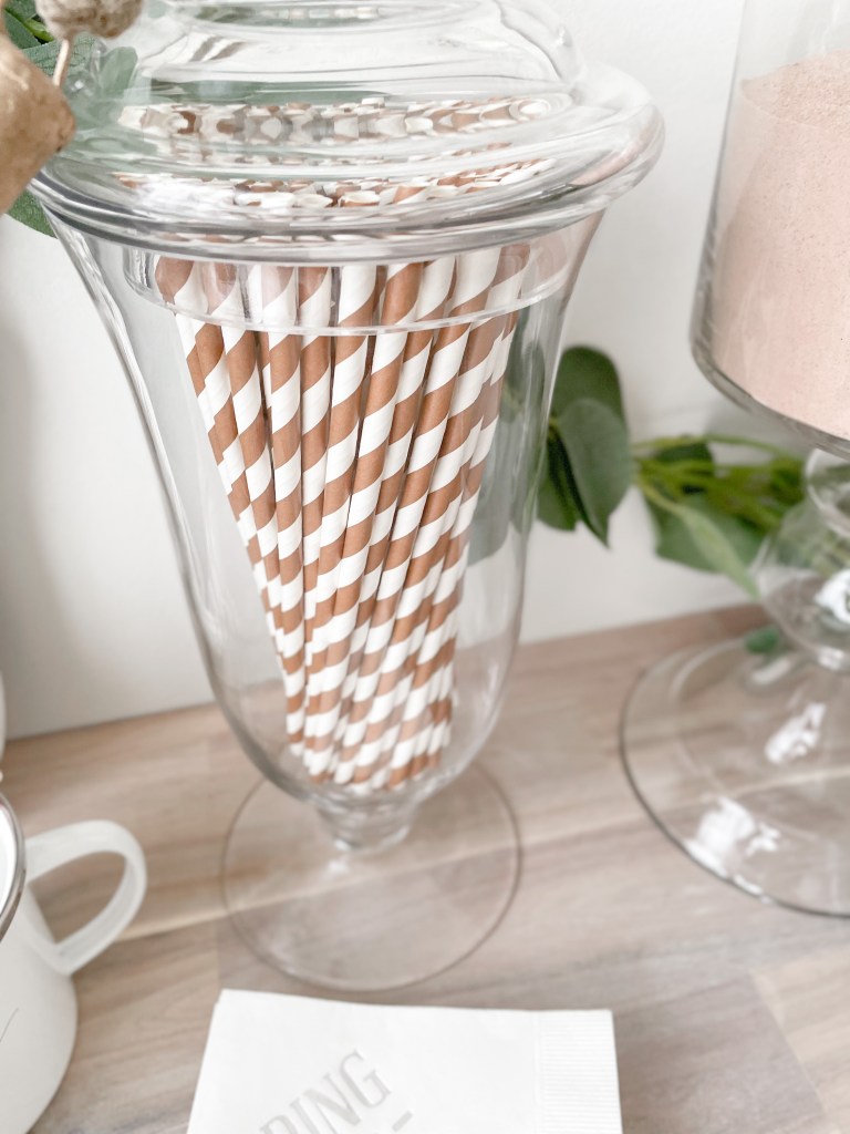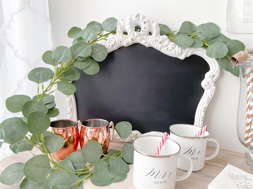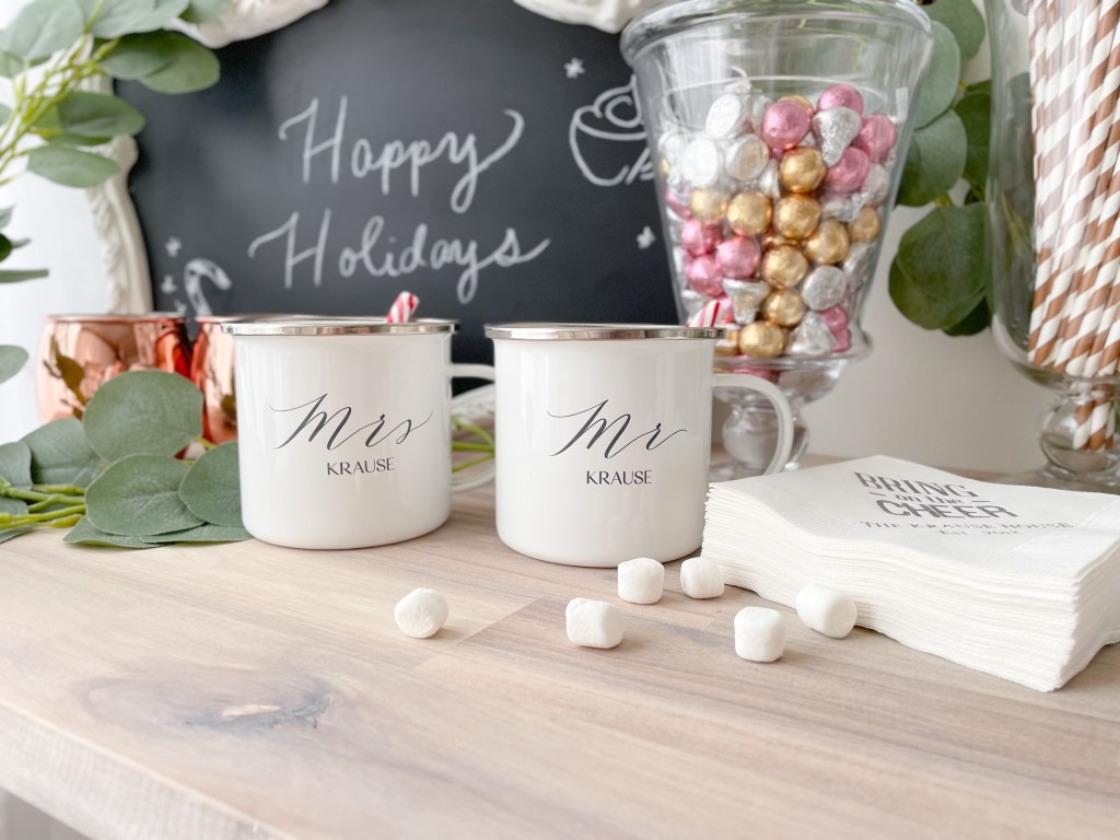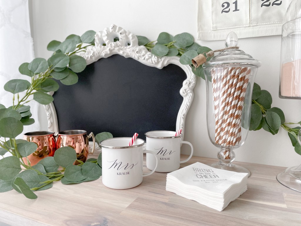 Our favourite part – mugs! Set out your favourites, and be sure to add in a few seasonal ones. Weddingstar carries a huge variety of high-quality enamel, ceramic, glass, and copper mugs. They feature designs such as wreath monograms, snowflakes, and holiday quotes, and you can add your families names, special dates, or initials to them, as well!