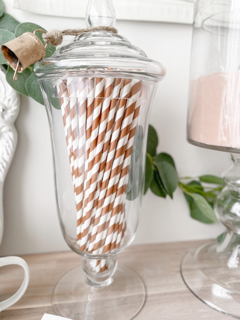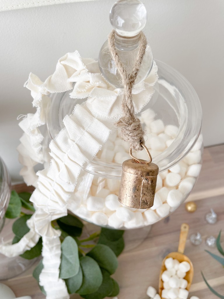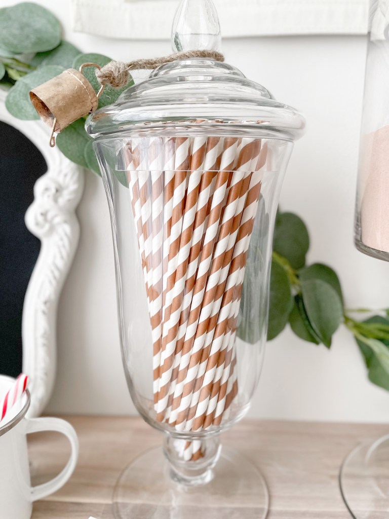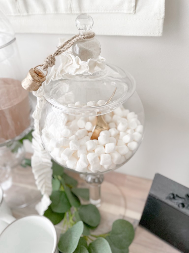 After you’ve chosen your spot, you will need a few receptacles for your hot chocolate ingredients. We prefer glass vessels, like the lidded apothecary vases below, so that you can see the ingredients inside. However, if you prefer something opaque, try out ceramic jars with chalk labels indicating each containers contents. Three containers is usually a good number to start with; one for instant hot chocolate powder, another for marshmallows, and a third for candy and/or candy canes. Vases also do the trick for wrapped ingredients like chocolates!