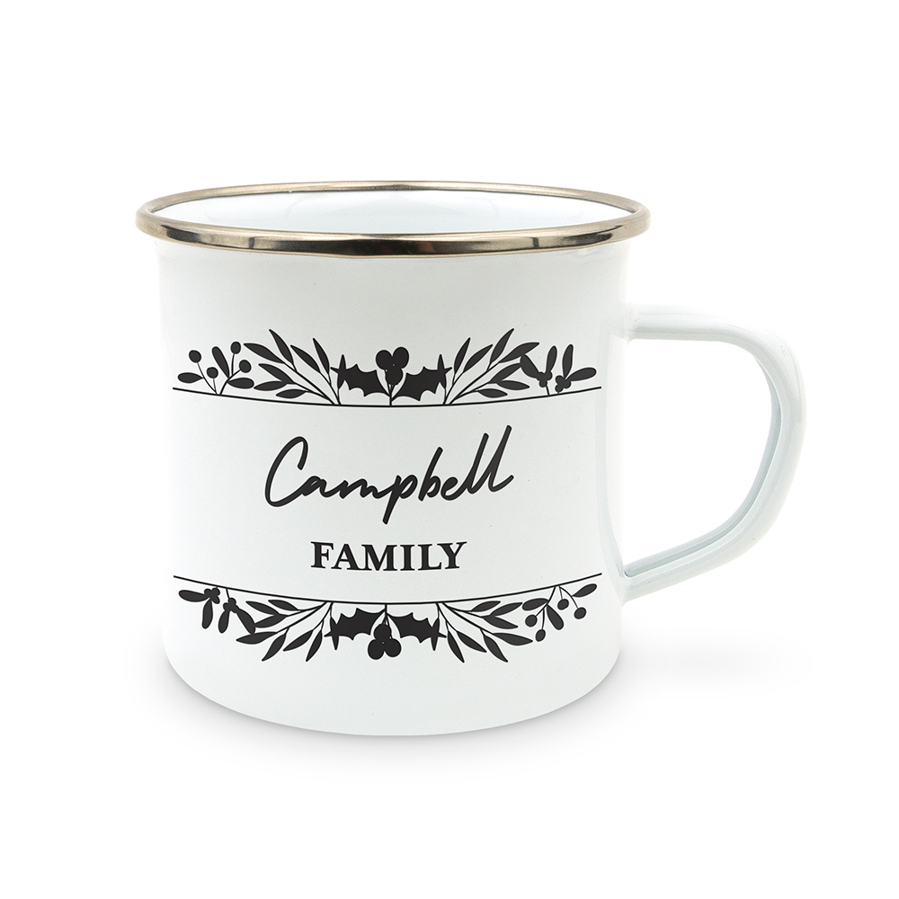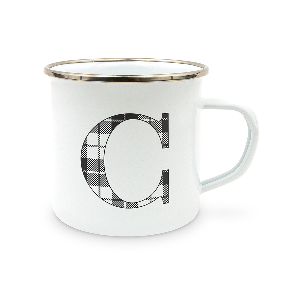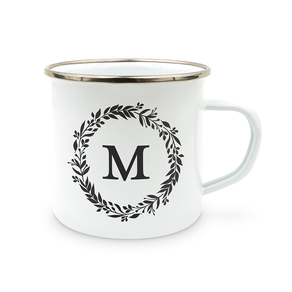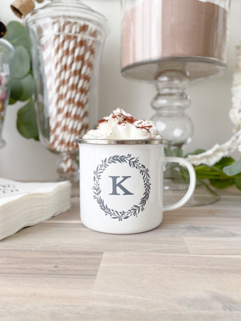 Personalized White Enamel Stainless Steel Coffee Mug – Buffalo Plaid Initial, Personalized White Enamel Stainless Steel Coffee Mug – Love Wreath Initial, Personalized White Enamel Stainless Steel Coffee Mug – Holly Berry Frame
