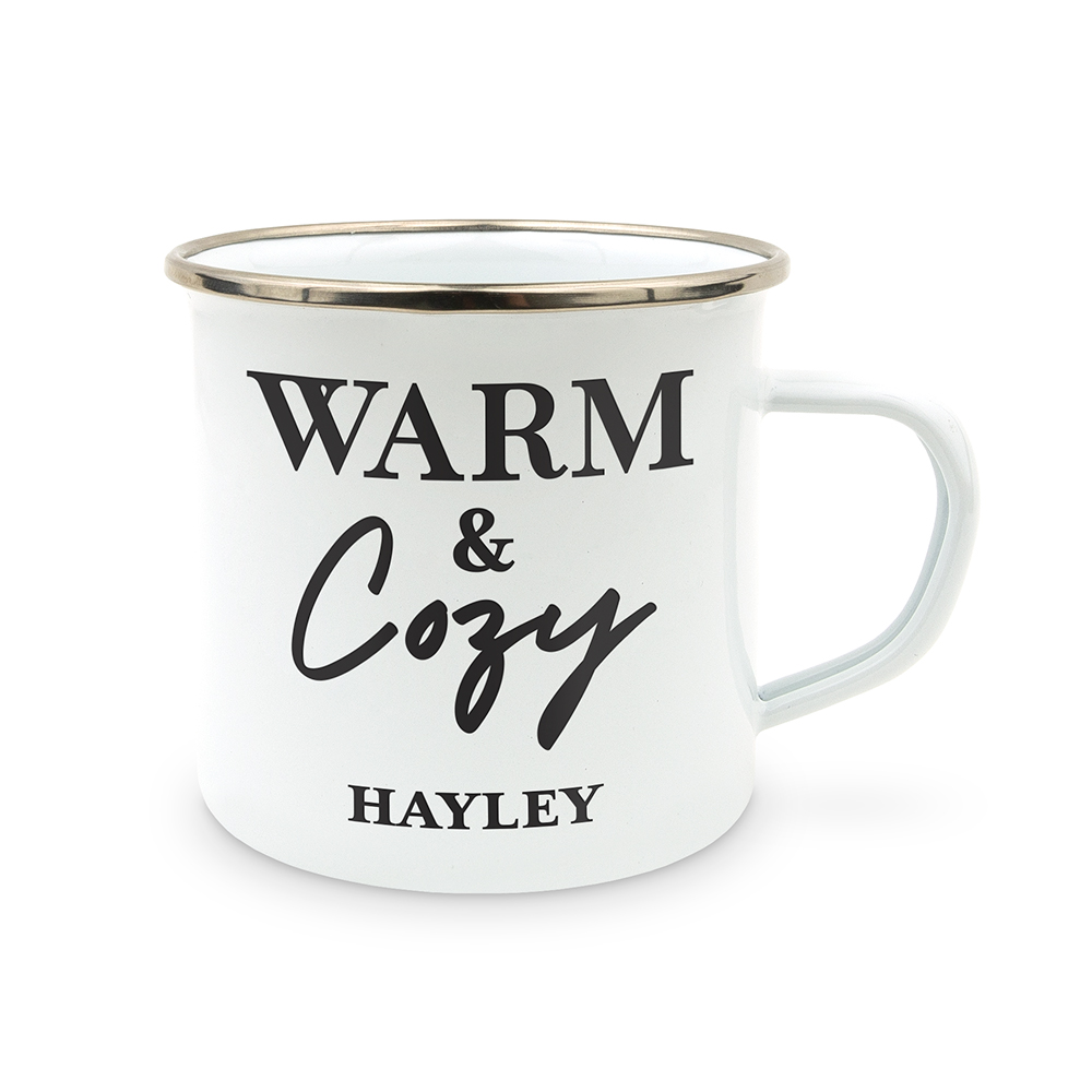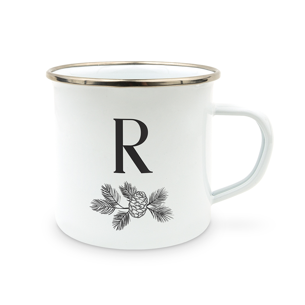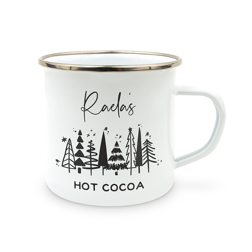 Personalized White Enamel Stainless Steel Coffee Mug – Knit Sweater Snowflake, Personalized White Enamel Stainless Steel Coffee Mug – Blush Initial, Personalized White Enamel Stainless Steel Coffee Mug – Winter Pines