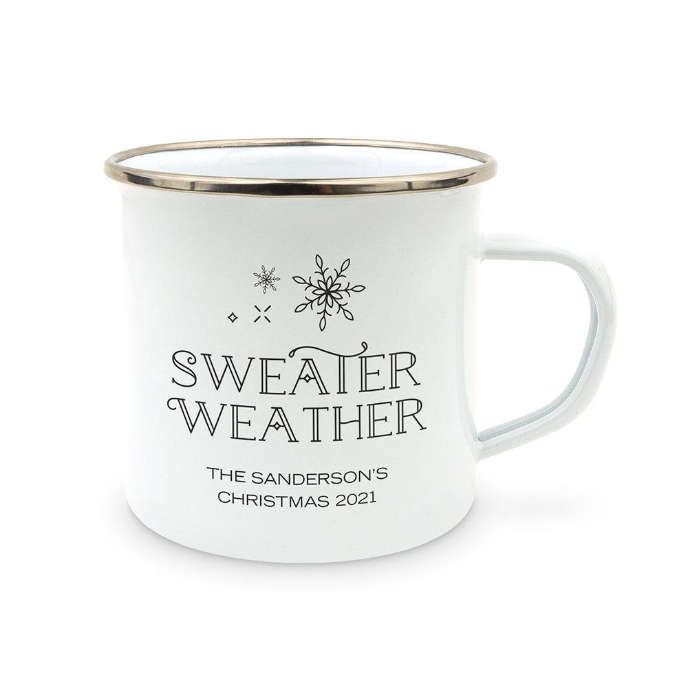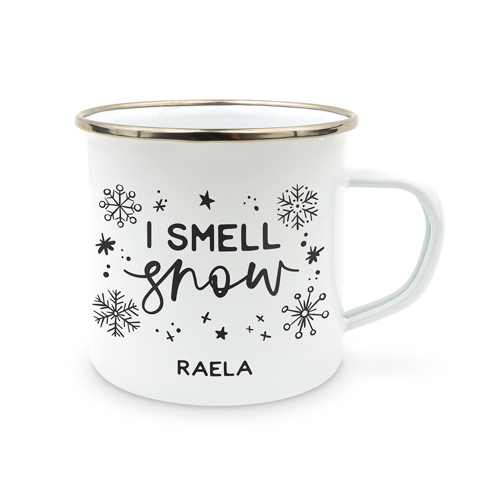 Personalized White Enamel Stainless Steel Coffee Mug – Sweater Weather, Personalized White Enamel Stainless Steel Coffee Mug – I Smell Snow