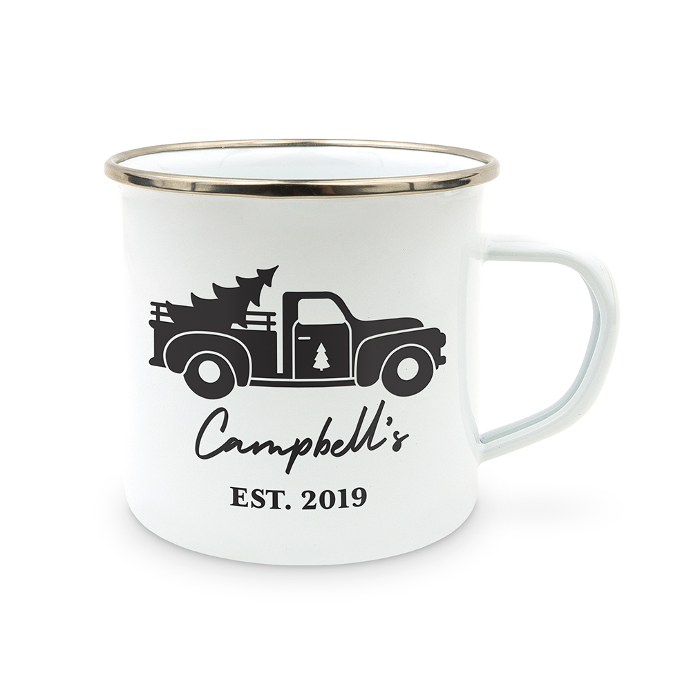 Personalized White Enamel Stainless Steel Coffee Mug – Warm & Cozy, Personalized White Enamel Stainless Steel Coffee Mug – Christmas Truck