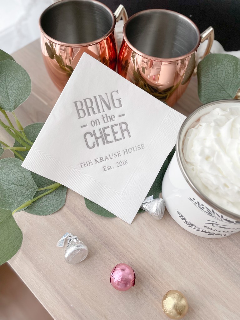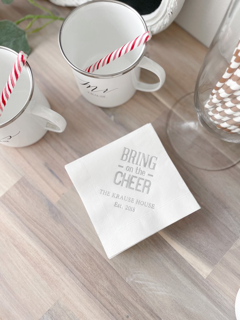 And now, for the finishing touch to your hot chocolate station: holiday theme foil-printed napkins, customized wth your family’s name. Side bonus – you can use any extras for your holiday parties and Christmas dinner!