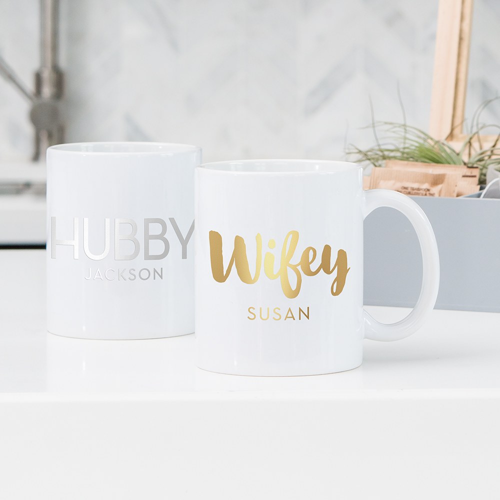 Custom White Ceramic Coffee Mug – Hubby Print, Custom White Ceramic Coffee Mug – Wifey Print