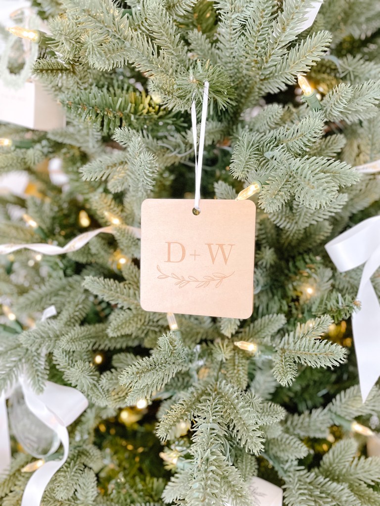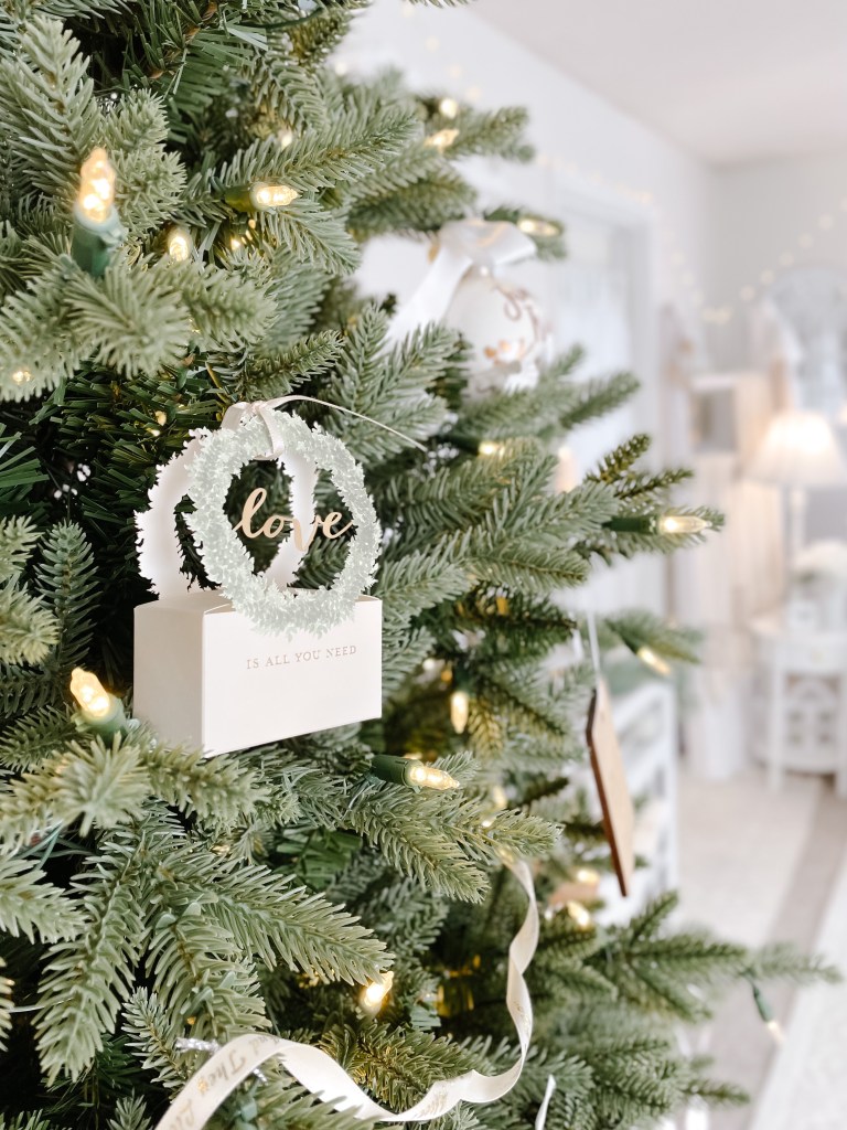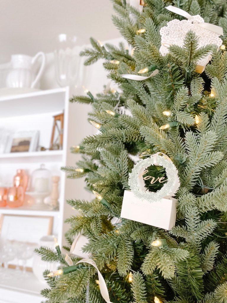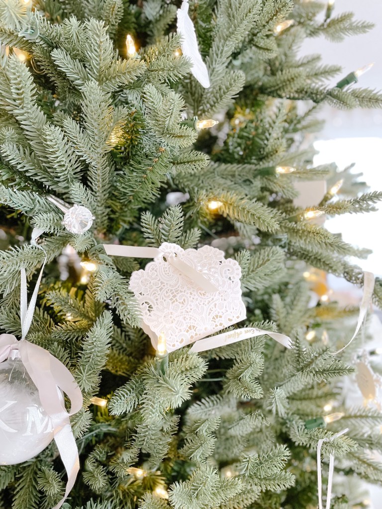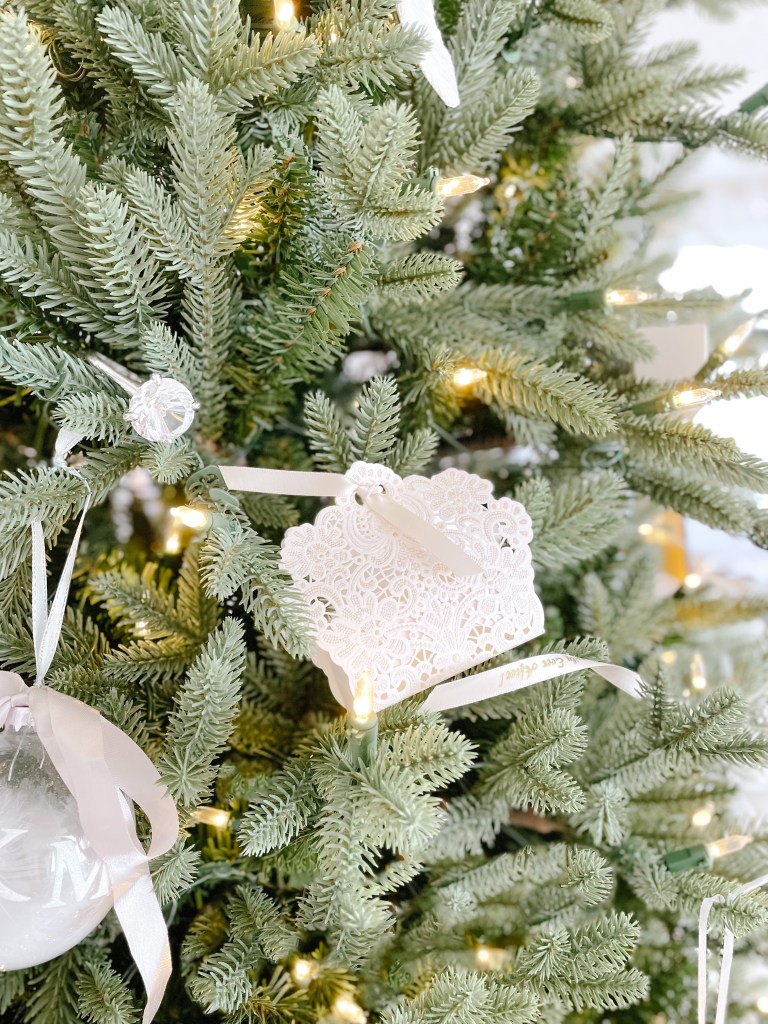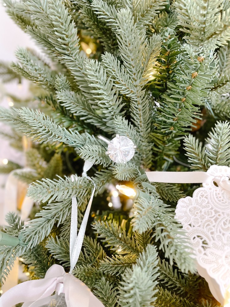 Etched glass ornaments hung with a simple white ribbon are as delicate as they are impactful. As seen below, I have added an additional silk ribbon in a whimsical bow to take it’s prettiness up another notch (don’t worry, the ribbon is also featured down this list!).