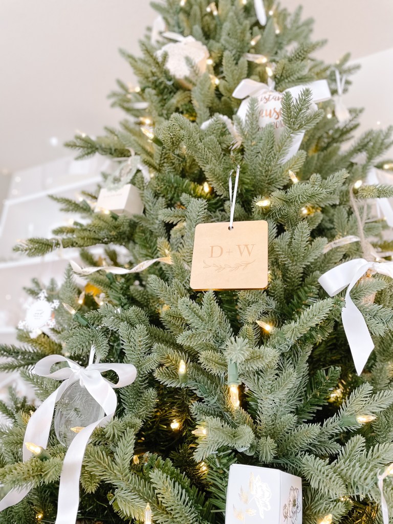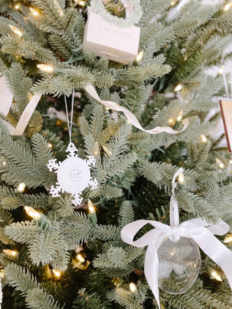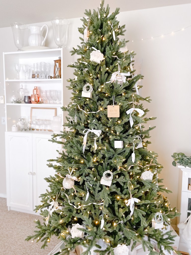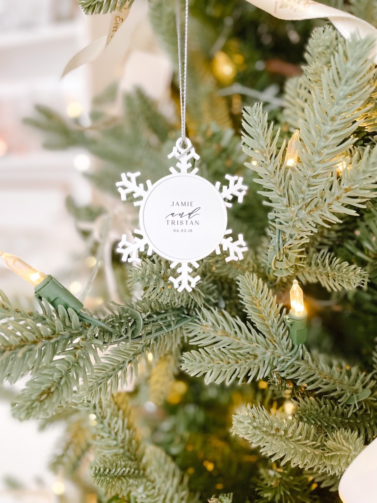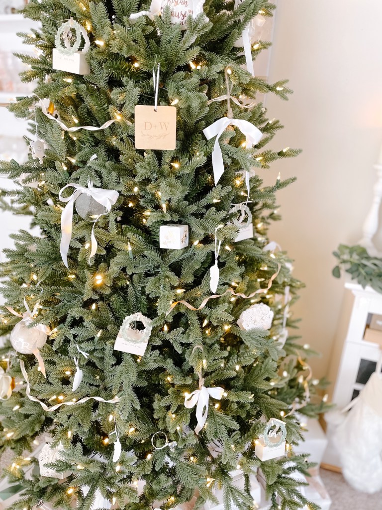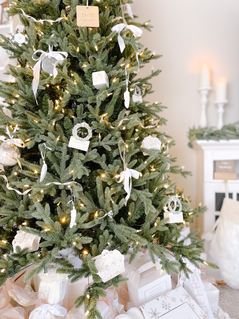 Etched glass ornaments hung with a simple white ribbon are as delicate as they are impactful. As seen below, I have added an additional silk ribbon in a whimsical bow to take it’s prettiness up another notch (don’t worry, the ribbon is also featured down this list!).