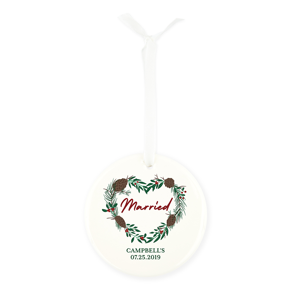 Personalized Round White Ceramic Christmas Tree Ornament – A Little Bit Of Heaven In Our Home, Personalized Round White Ceramic Christmas Tree Ornament – Pine Bough Wreath, Personalized Round White Ceramic Christmas Tree Ornament – Holly Berry Frame