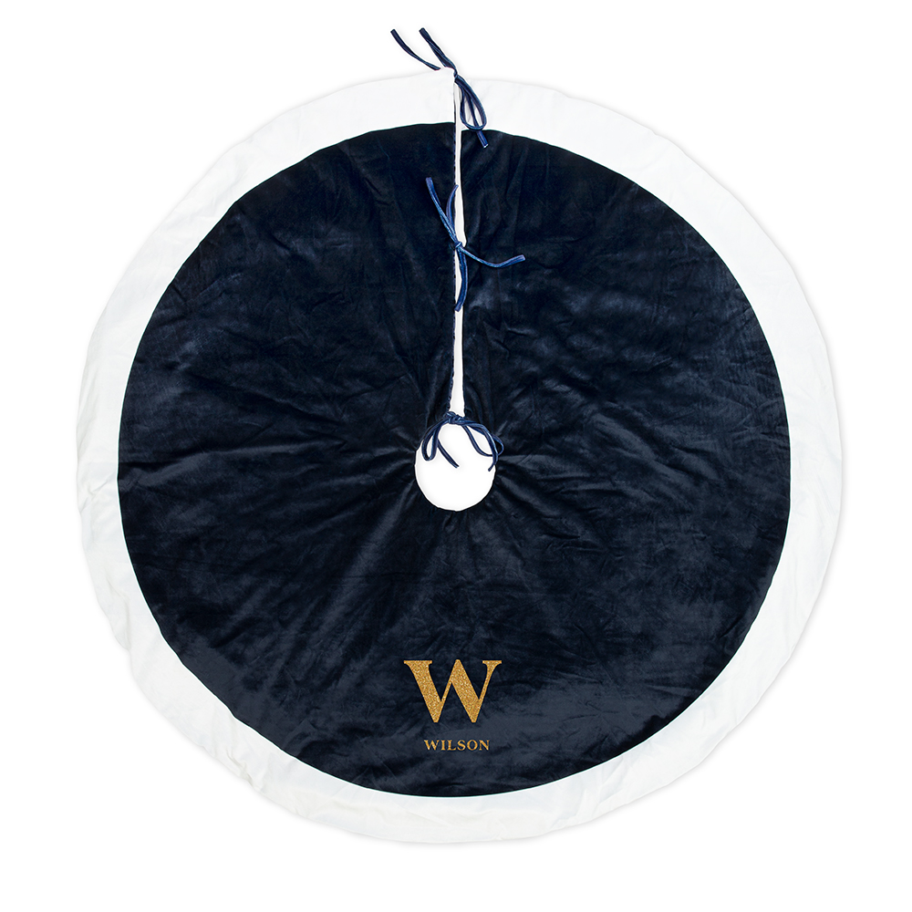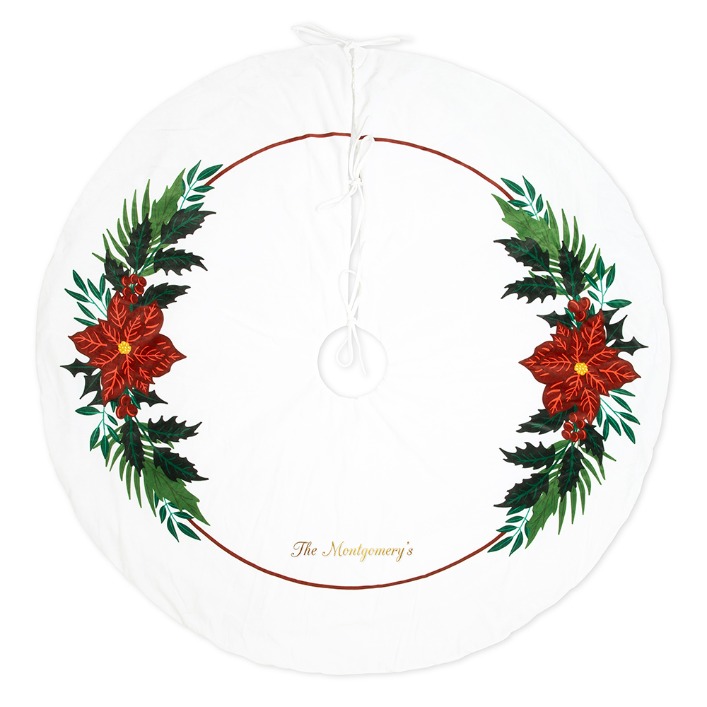 Custom Embroidered Plush Fabric Christmas Tree Skirt – Poinsettia, Personalized Plush Fabric Traditional Christmas Tree Skirt – Full Monogram