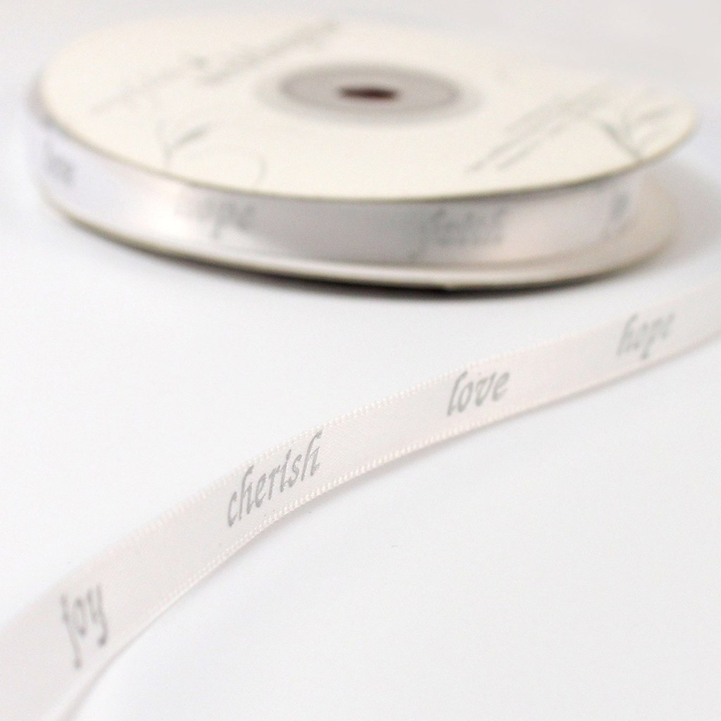 Here is the aforementioned ribbon! Available in dozens of colours and sizes, you can order as much or as little ribbon as you want with Weddingstar. Order plain varieties, or see the printed options below. You can even have your own personalized messages created! The sky is the limit when it comes to ribbons with Weddingstar.