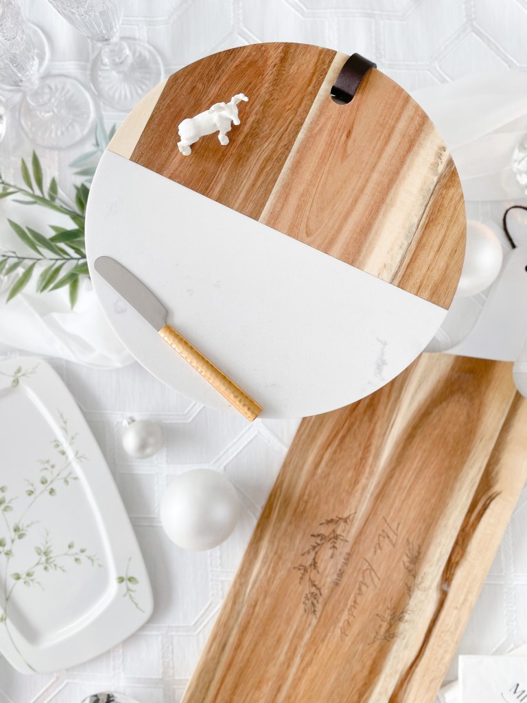 Always start with serving boards. Choose from rustic, round styles to elegant, marbled styles, and even boards with built in utensils.