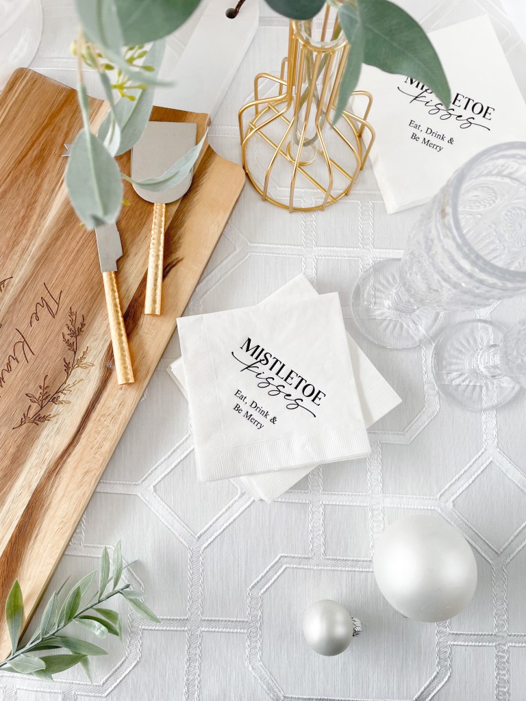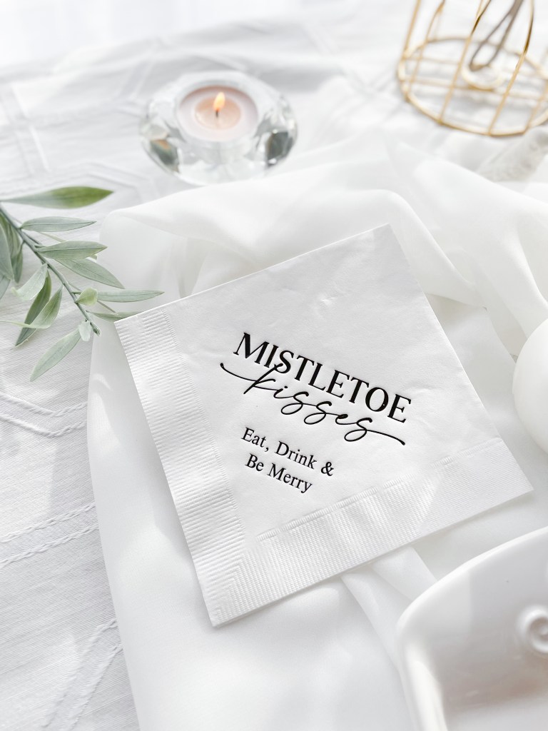 Personalized Foil Printed Paper Napkins – Merry Midnight Merry Christmas, Personalized Foil Printed Paper Napkins – Mistletoe Kisses