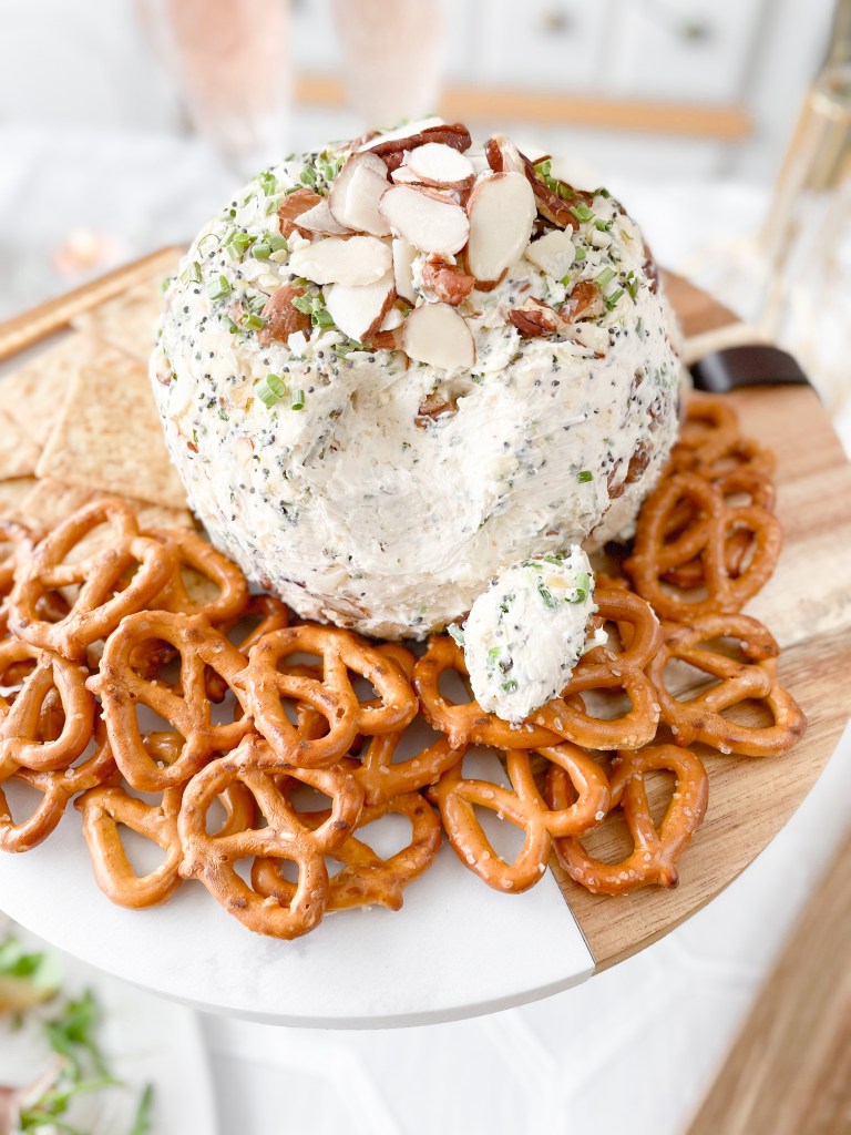 In a small container or bowl, combine cheese ball crust seasonings and mix well. Just before serving, roll ball generously in seasonings. Place in the centre of your serving board, and top generously with slivered almonds and chopped pecans.