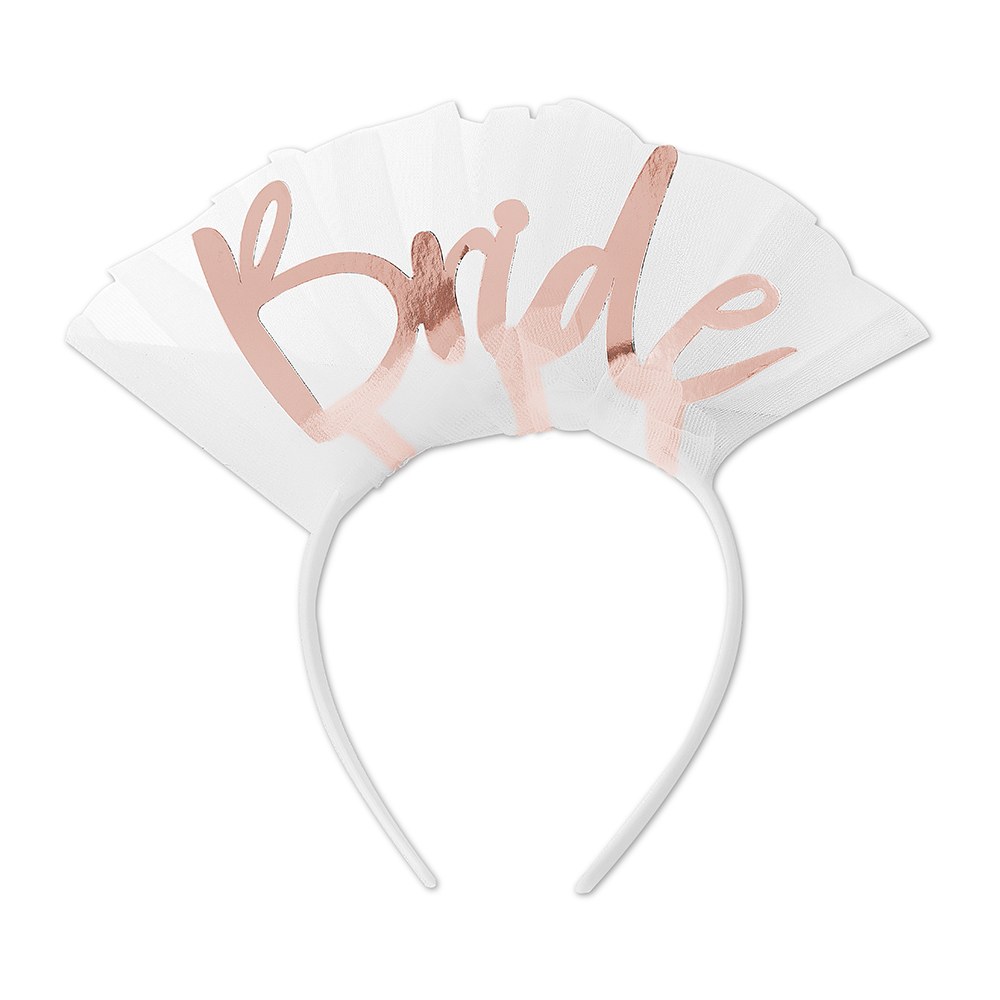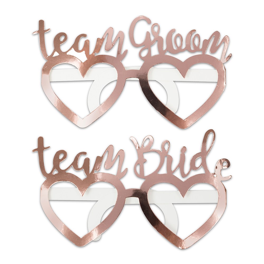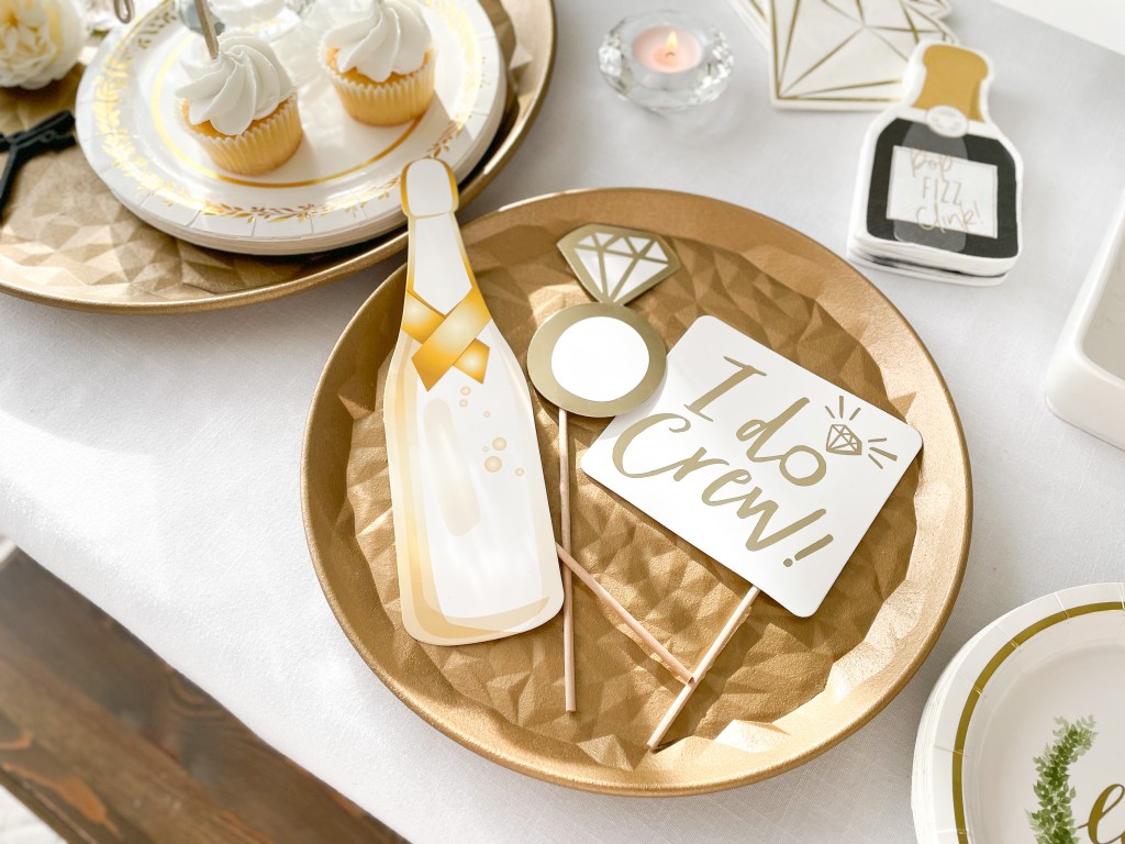 Mix in a few extras, like foil adorned paper glasses, and a bridal party headband.