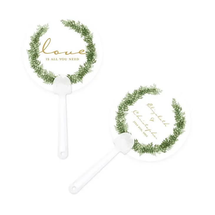 Personalised Paper Hand Fan Wedding Favour – Love Wreath, Personalised Foil Printed Paper Hand Fan Wedding Favour – Signature Script